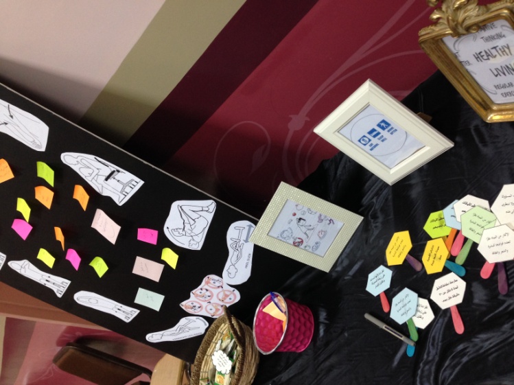 كما أتاحت المشاركة للزائرات كتابة آرائهن وقراراتهن المستقبلية للمحافظة على الصحة والبدء بأسلوب حياة صحي وناجح من خلال الكتابة في بطاقات ملونة وتعليقها في لوحة.