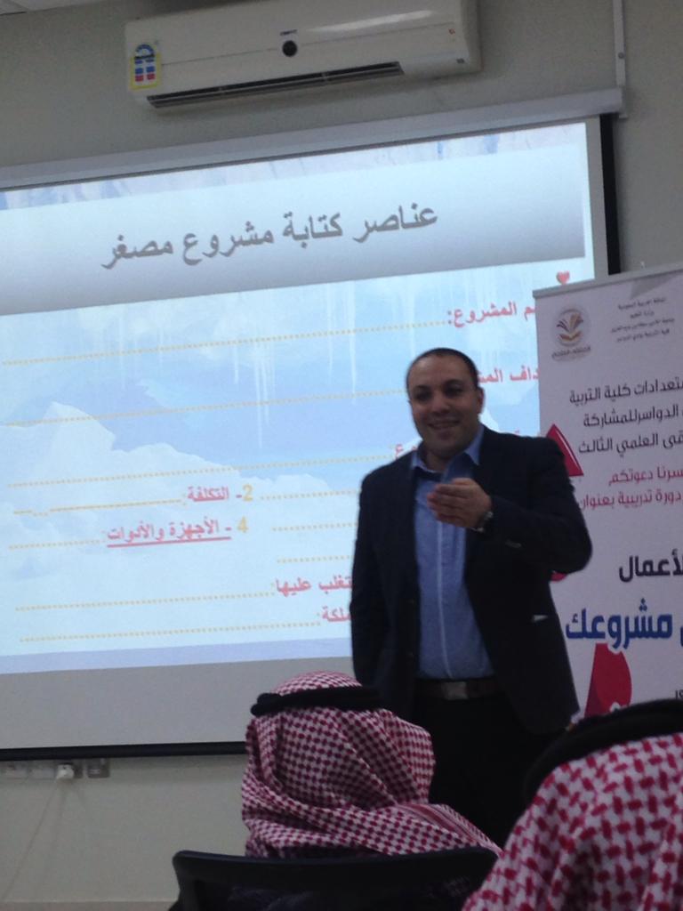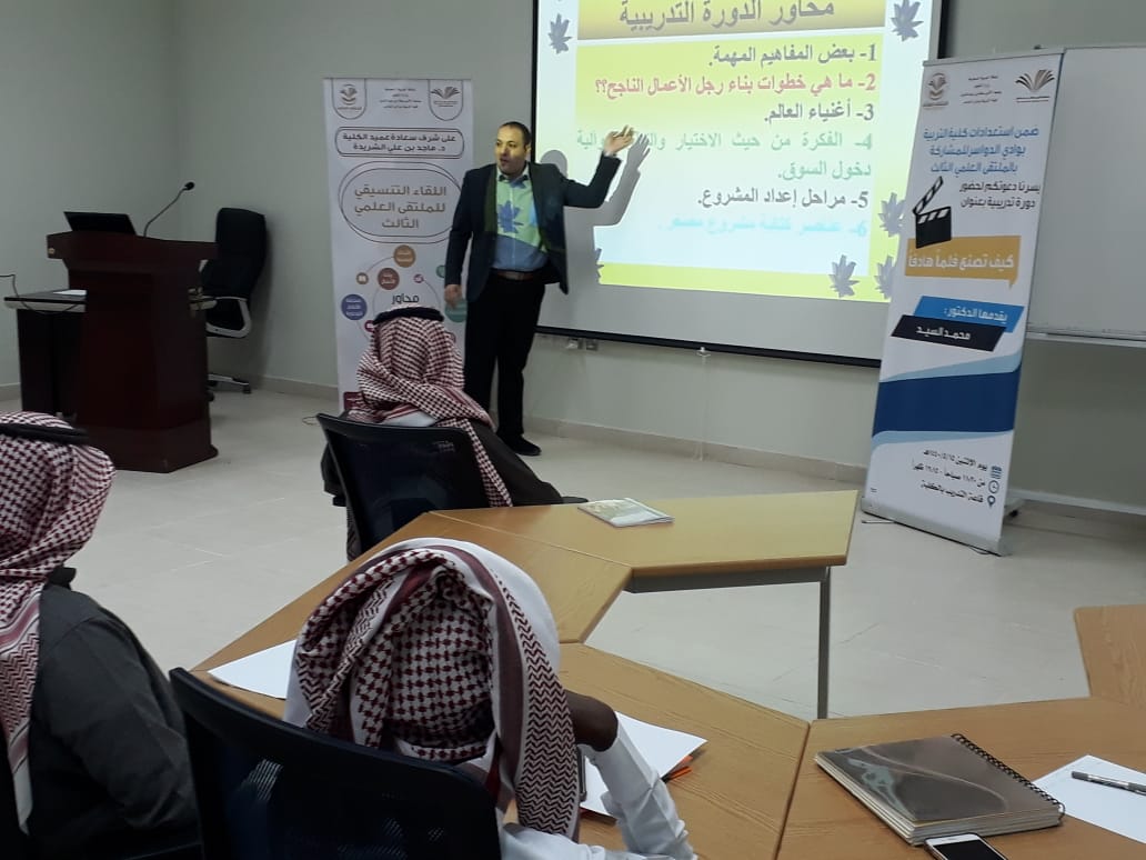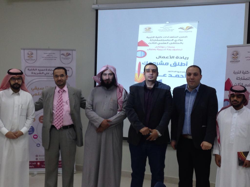 استعدادًا للمشاركة بالملتقى العلمي الثالث وبتوجيه عميد كلية التربية د. ماجد علي الشريدة الذ يحرص دائما علي إقامة مثل هذه الفعاليات تشجيعا للطلاب ، والدكتور/ فليان بن شبيب السبيعي منسق الملتقى العلمي الثالث أقامت كلية التربية بوادي الدواسر يوم الاحد الموافق 21/ 5/ 1440 ه ورشة عمل لريادة الأعمال بعنوان "اطلق مشروعك" أعدها وقدمها الدكتور/ احمد محمد عزازي ، أستاذ التربية الخاصة المساعد بالكلية .