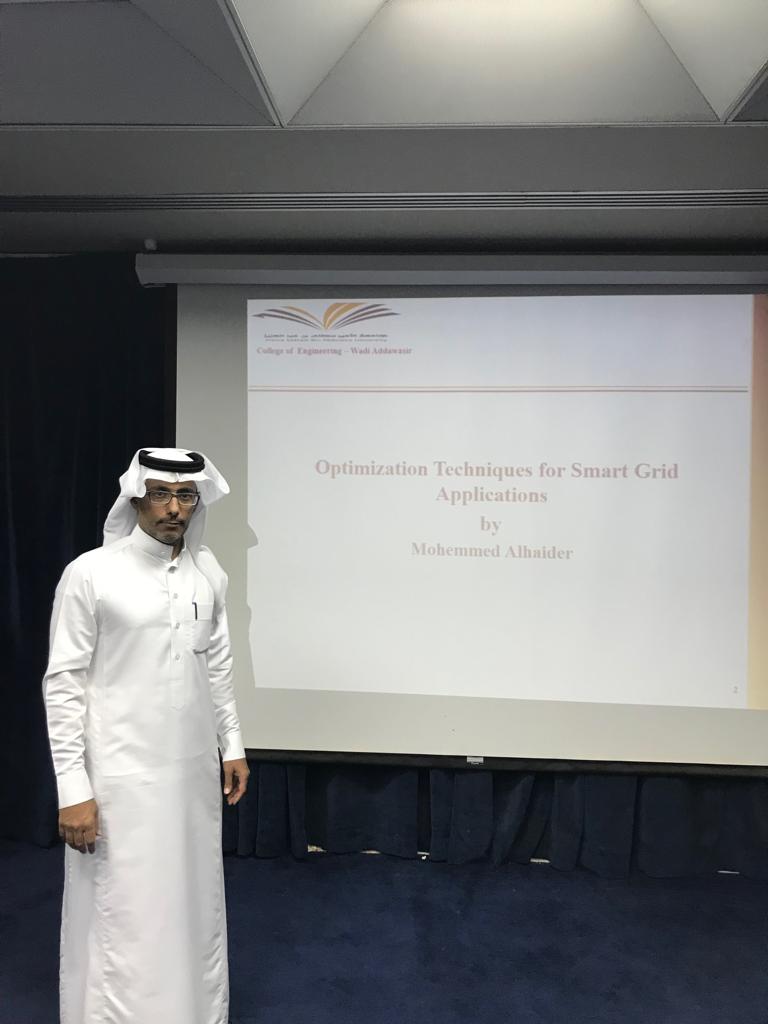 1439 /1440هـ قدم الدكتور / محمد الحيدر من قسم الهندسة الكهربائية اليوم الخميس الموافق 1440/3/28هـ حلقة النقاش العلمية والتي تندرج تحت عنوان "أستخدام النماذج المثلى لتطبيقات الشبكات الكهربائية الذكية " والتي اقيمت بمسرح الكلية .