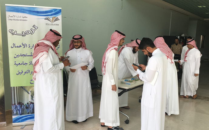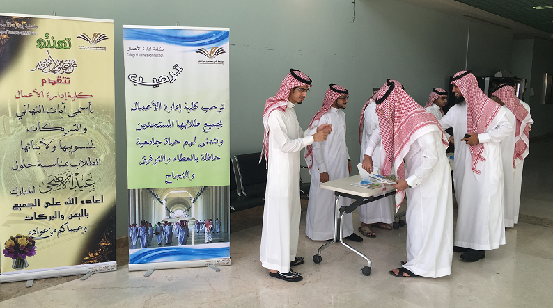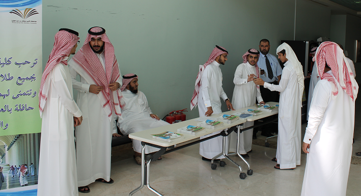 برعاية سعادة الدكتور / ناصر بن سعد القحطاني ، عميد الكلية و سعادة الدكتور / علي الزهراني ، وكيل الكلية للشؤون التعليمية والاكاديمية وسعادة مدير الادارة محمد عبد المطلوب حمدان ، نظمت لجنة الانشطة الطلابية حفل استقبال الطلاب الجدد خلال الاسبوع الأول للفصل الدراسي الحالي ، حيث تم توزيع الكتيبات الارشادية عن الكلية وتخصصاتها المختلفة والحديث عن آليات الارشاد الأكاديمي وأهميته والخطط الدراسية وأماكن القاعات والدعوة للمشاركة في الأنشطة الصفية واللاصفية وبعد ذلك تم توجيههم الى شؤون الطلاب لطباعة جداولهم الدراسية ومن ثم تعريفهم بجميع القاعات الدراسية بالكلية والاجابة عن كافة الاستفسارات وإيصال رسالة مفادها ان الكلية مع الطالب من اليوم الاول .