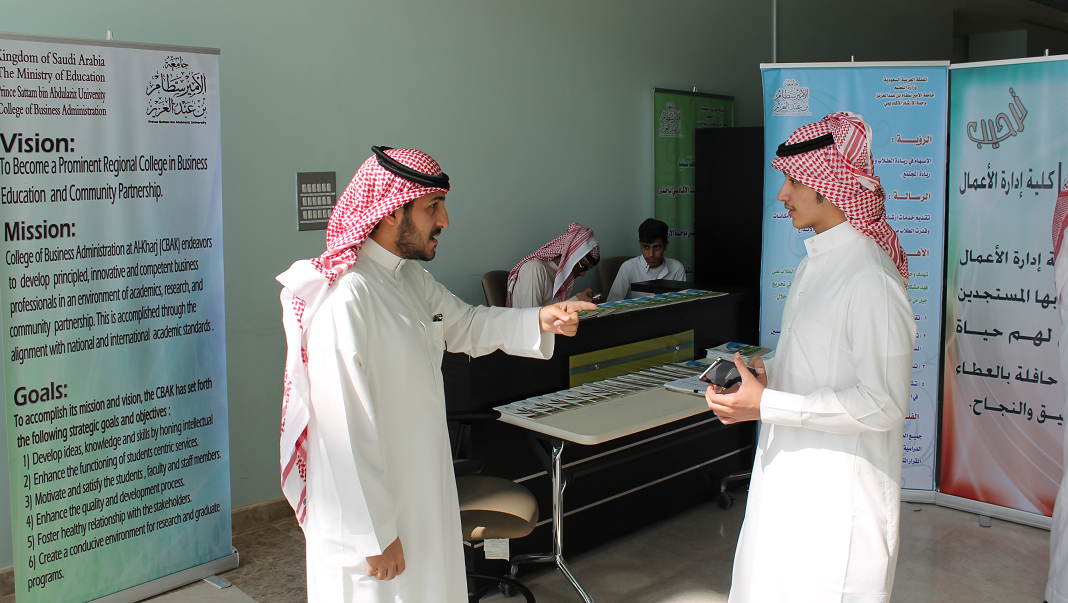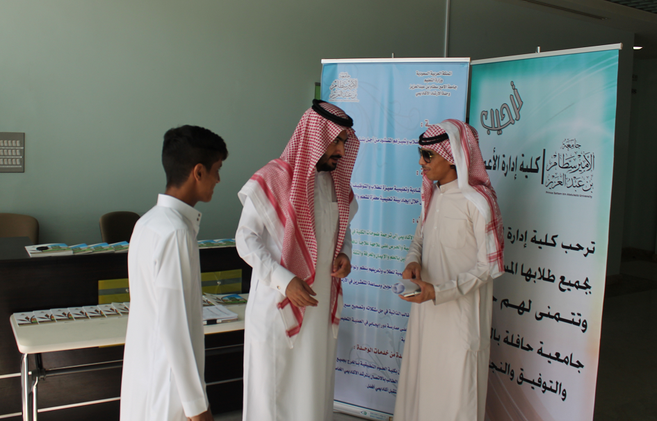 نظمت لجنة الانشطة الطلابية استقبال الطلاب الجدد خلال الاسبوع الأول للفصل الحالي بكلية ادارة الاعمال برعاية عميد الكلية الدكتور ناصر بن سعد القحطاني ، و الدكتور علي الزهراني وكيل الكلية للشؤون التعليمية والاكاديمية وسعادة مدير الادارة الاستاذ محمد بن عبد المطلوب حمدان ، حيث تم توزيع الكتيبات الارشادية عن الكلية وتخصصاتها المختلفة والحديث عن آليات الارشاد الأكاديمي وأهميته والخطط الدراسية وأماكن القاعات والدعوة للمشاركة في الأنشطة الصفية و اللاصيفية وبعد ذلك تم توجيههم الى شؤون الطلاب لطباعة جداولهم الدراسية ومن ثم تعريفهم بجميع القاعات الدراسية بالكلية والاجابة عن كافة الاستفسارات وإيصال رسالة مفادها ان الكلية مع الطالب من اليوم الاول متمنيني التوفيق للجميع .