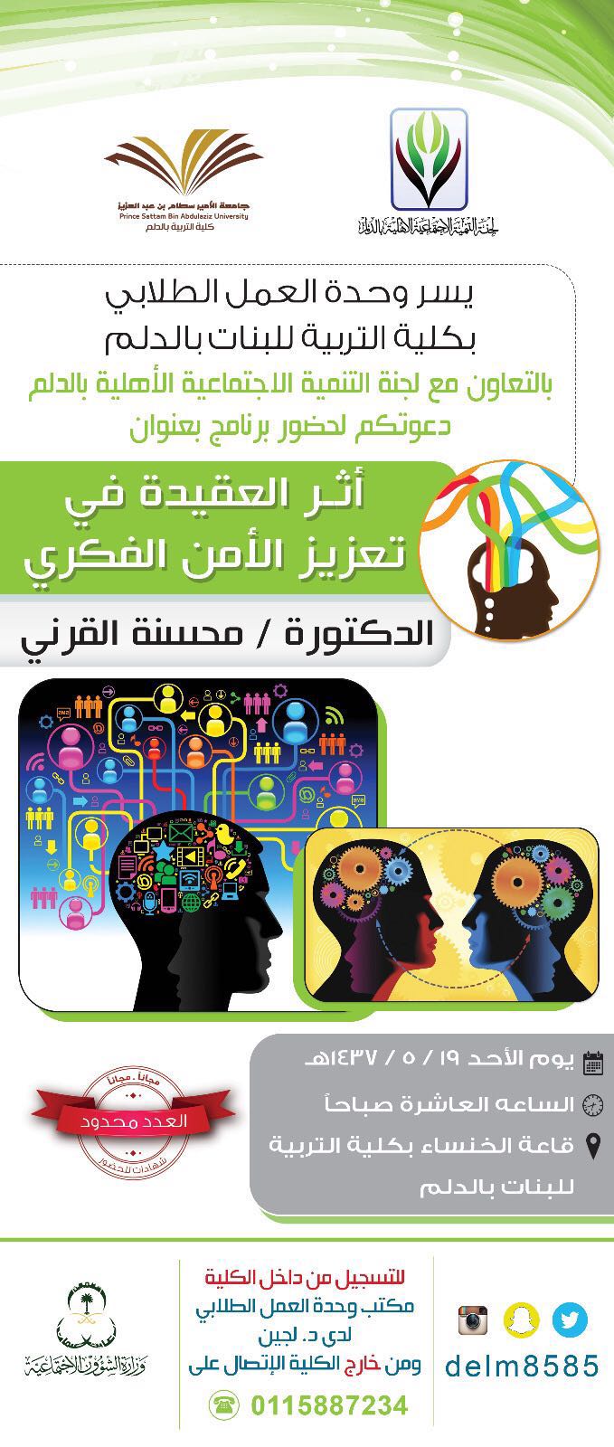 تعتزم وحدة العمل الطلابي وبالتعاون مع لجنة التنمية الاجتماعية الأهلية بالدلم أقامة برنامج بعنوان ( أثر العقيدة في تعزيز الأمن الفكري للدكتورة محسنة القرني ، يوم الأحد القادم 19/5/1437هـ الساعة العاشرة بقاعة الخنساء .