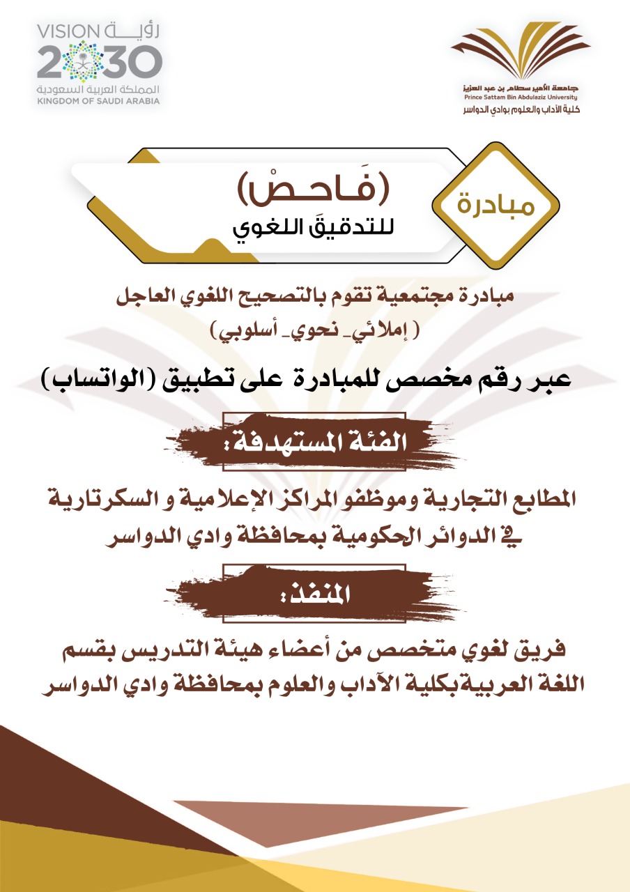 أقامت وحدة خدمة المجتمع في قسم اللغة العربية حفل إطلاق مبادرة (فَاحِصْ) للتدقيق اللغوي ، وهي مبادرة مجتمعية تقوم بالتصحيح اللغوي العاجل ( إملائي_ نحوي_ أسلوبي) عبر رقم مخصص للمبادرة على تطبيق (الواتساب)