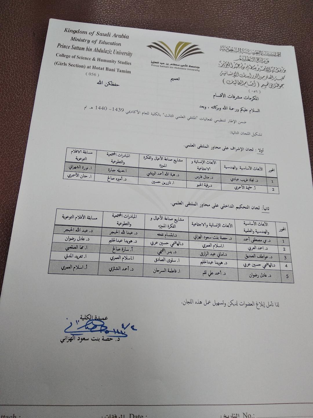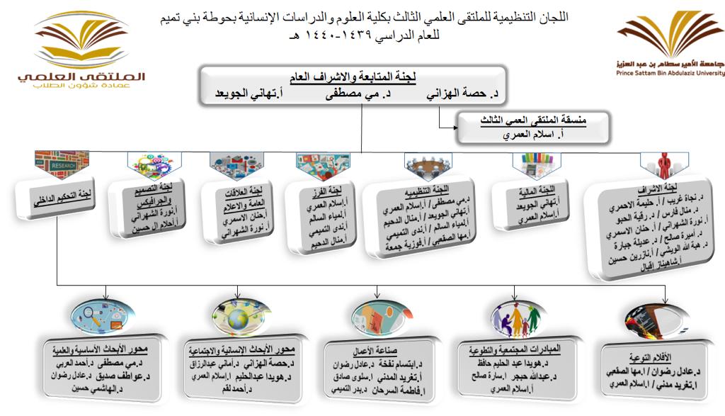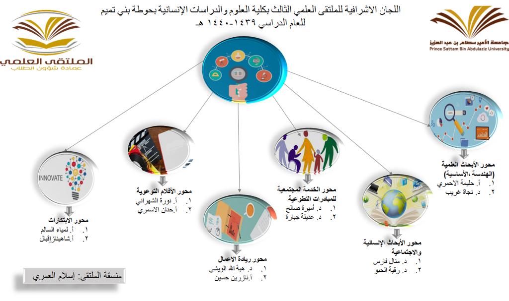 في اطار التنظيمات المعدة للملتقى العلمي الثالث بكلية العلوم والدراسات الإنسانية بحوطة بني تميم و تحت رعاية عميدة الكلية الدكتورة حصة الهزاني وبحضور مساعدة العميدة للشؤون التعليمية د.مي مصطفى ومنسقة الملتقى العلمي الثالث ا.اسلام العمري، تم الاجتماع في صباح يوم الخميس الموافق 28/ 3/ 1440 هــ وذلك لتحديد لجان الاشراف على المحاور الملتقى ولجان الاشراف ولجنة التحكيم الداخلية التي تكونت من العنصر النسائي والعنصر الرجال بكلية ادارة الاعمال. كما تم تحديد لجنة الفرز الداخلية لجميع المحاور المشاركة من طالبات الكلية حيث تم ترشيح عدد من الأعضاء لأقامت الدورات والورش التدريبية للطالبات بعد الاعلان بكل قسم عن البرامج التحضيرية للملتقى العلمي الثالث في كلية العلوم بالحوطة، حيث تم التنسيق وعمل جدول خطة للإعمال تحضيرية لجميع الدورات والورش التي ستقام داخل الكلية بالتنظيم مع اللجنة التنظيمية والمنسقة والأعضاء، وحسب هذا الجدول تم تصميم الإعلانات ونشرها على الطالبات وإلصاقها على جدران اللوحات الإخبارية ونشرها في المنصات الإعلانية المختلفة.
