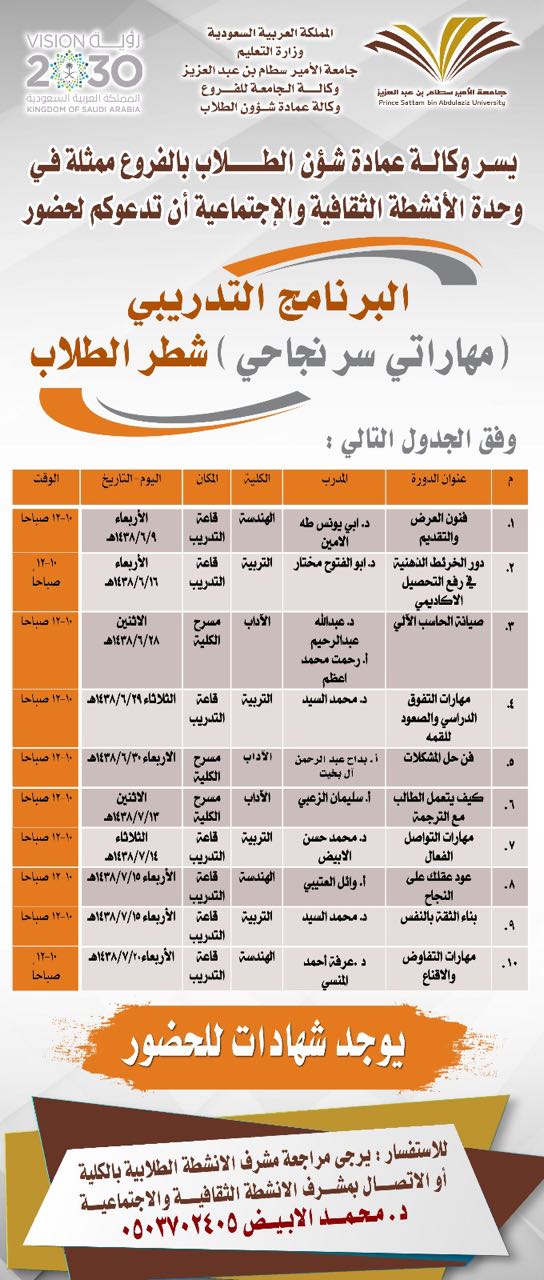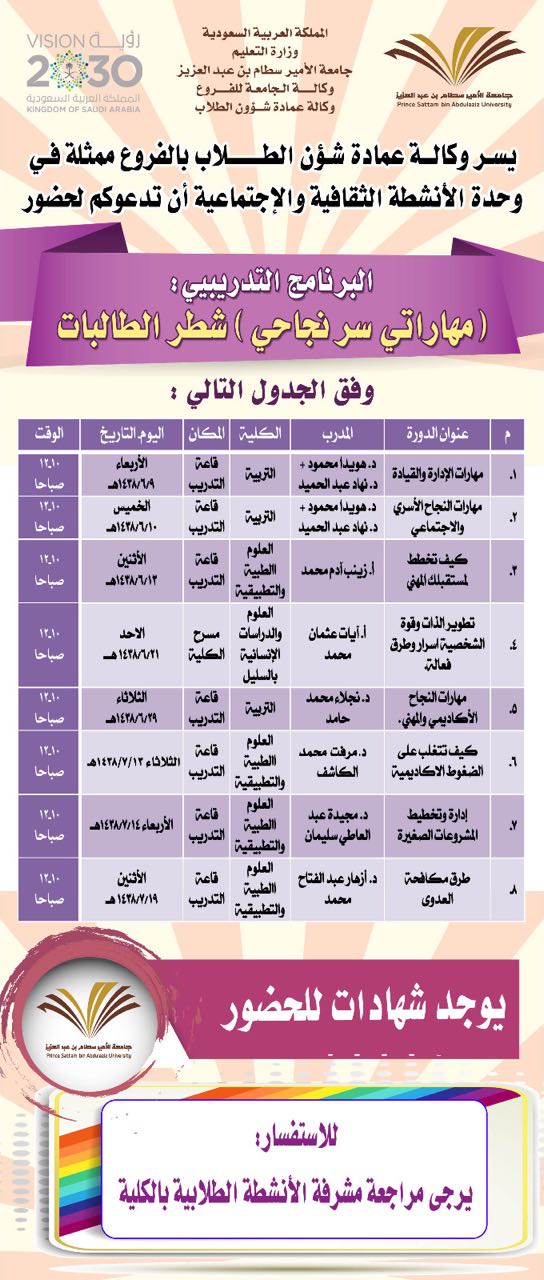 اعتمدت وكالة عمادة شؤون الطلاب بجامعة الأمير سطام بن عبدالعزيز بالفروع ممثلة في وحدة الأنشطة الثقافية والإجتماعية خطة البرامج التدريبة (مهاراتي سر نجاحي) للطلاب والطالبات لكليات محافظتي وادي الدواسر والسليل الذي أطلقته الوكالة خلال الأيام الماضية وتم عمل جدولة للدورات التدريبية.