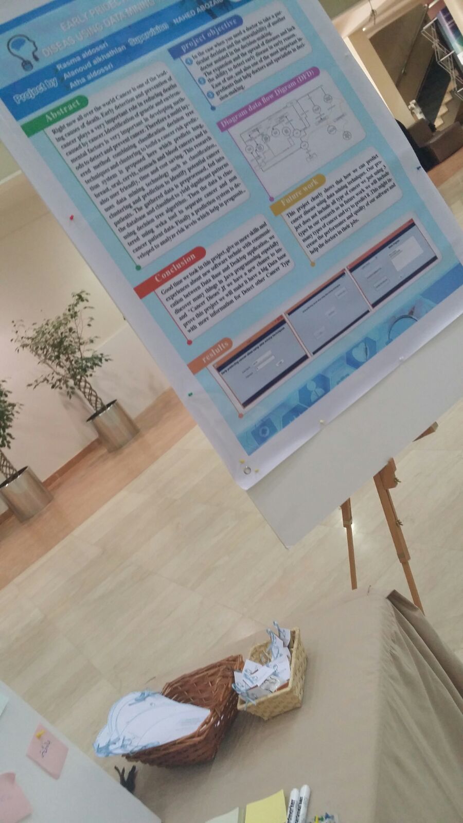 ثم قدمت الطالبة رسماء الدوسري بحثها بعنوان: (predicting cancer disease using data mining techniques)، وهو نظام خبير بنته الطالبة للكشف المبكر عن مرض السرطان، فهو يساعد الأطباء في اتخاذ القرار المناسب في الوقت المناسب؛ وبإمكان النظام أن يحل محل الطبيب في تشخيص المرض واقتراح العلاج المناسب، ويتميز البحث بدمجه بين الطب والهندسة في الكشف عن المرض، حتى وصفته إحدى الأكاديميات المشاركات بأنه "فريد من نوعه".
