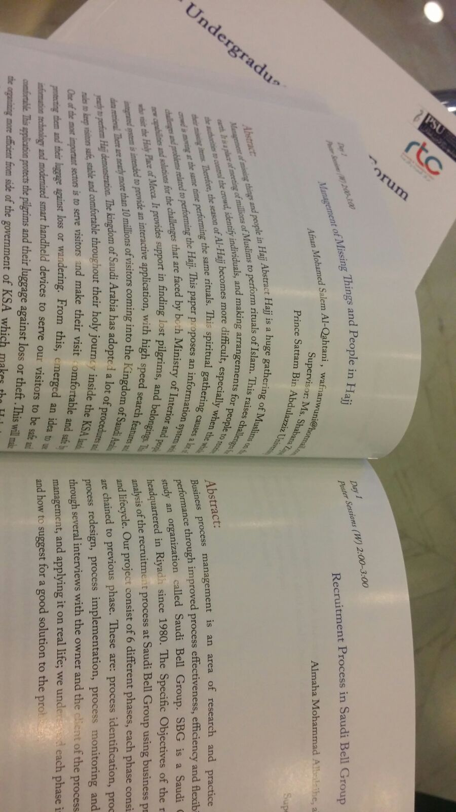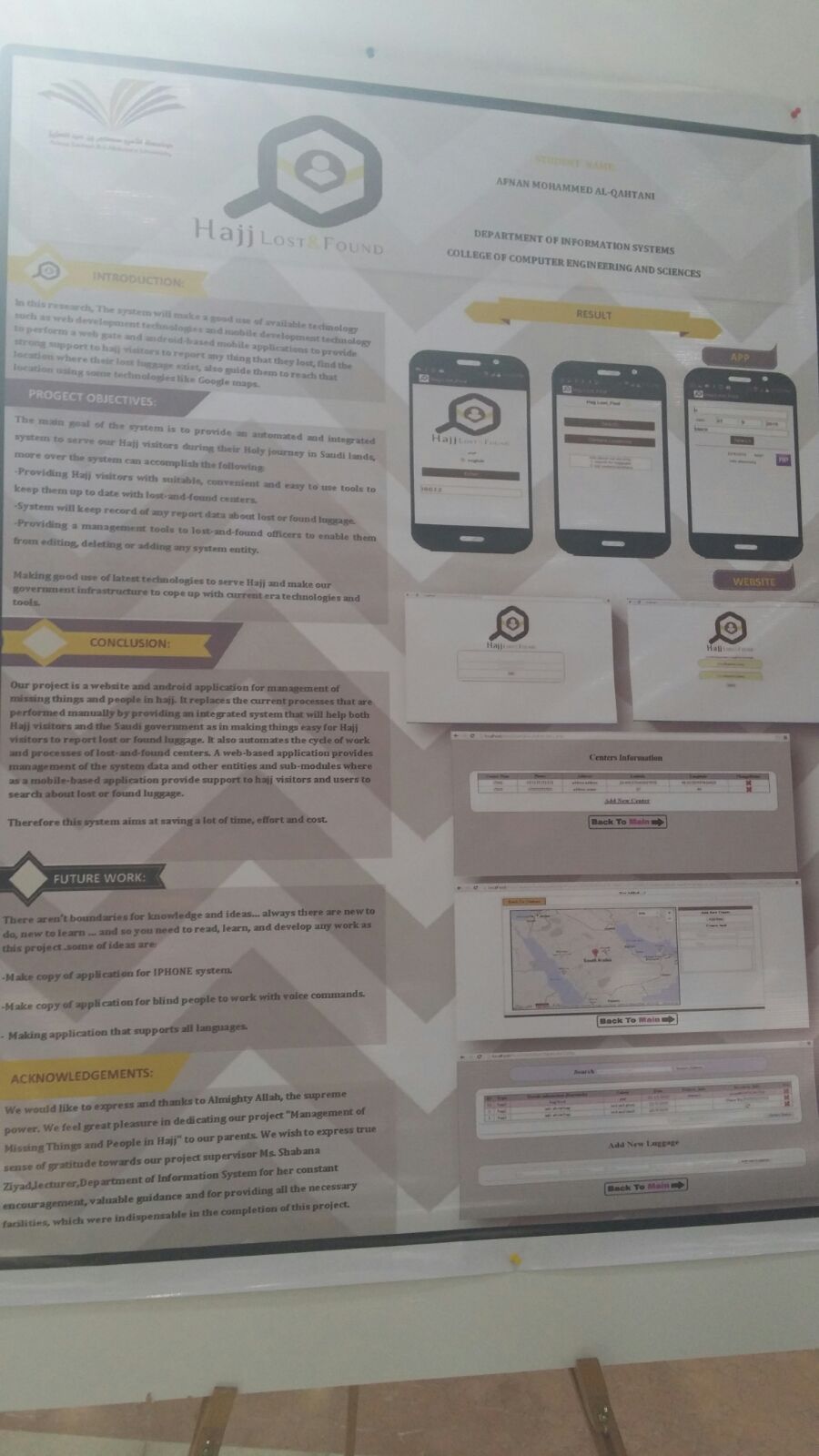 كذلك عرضت الطالبة أفنان القحطاني بحثها بعنوان: (management of missing things and people in hajj)، الذي وضع حلولًا مثالية ومتميزة في إدارة المفقودات خلال مواسم الحج،