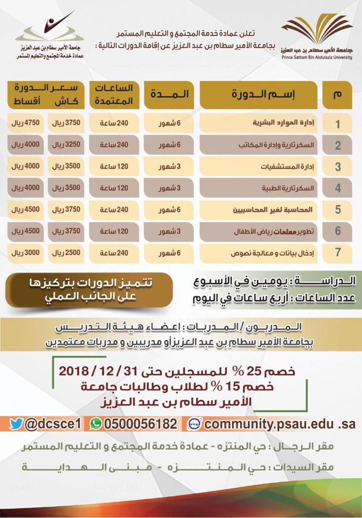 تعلن عمادة خدمة المجتمع والتعليم المستمر بجامعة الأمير سطام بن عبدالعزيز