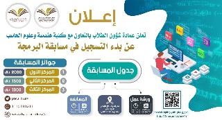نظمت عمادة شؤون الطلاب ورشة عمل تعريفية بـ "مسابقة البرمجة" والتي تنفذها العمادة بالتعاون مع كلية هندسة وعلوم الحاسب صباح اليوم الثلاثاء 10 / 6 /1441هـ بمقر نادي الإبداع الرقمي.