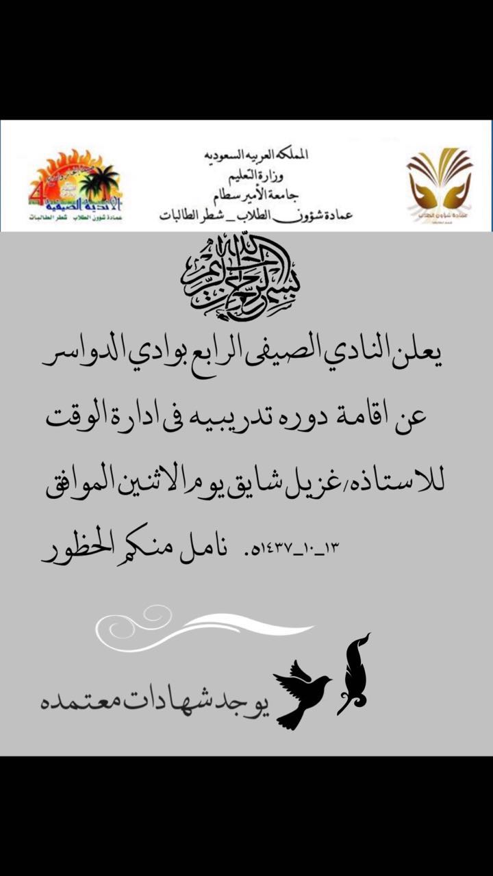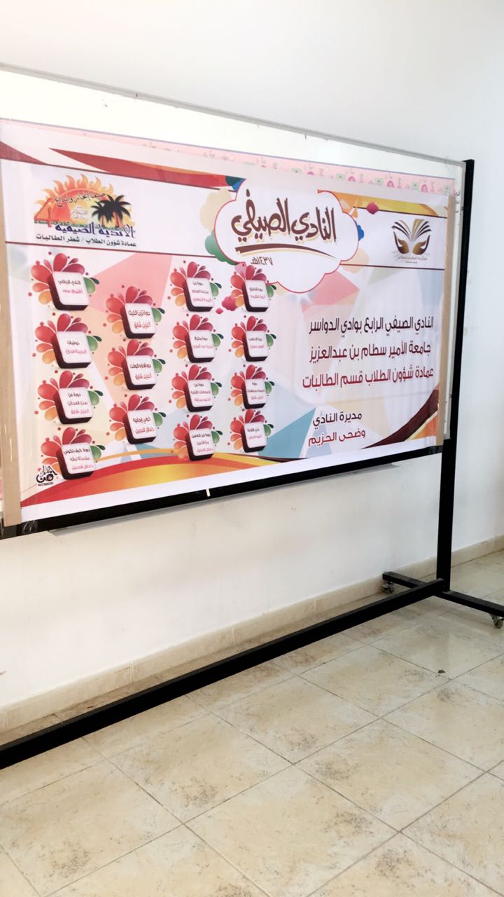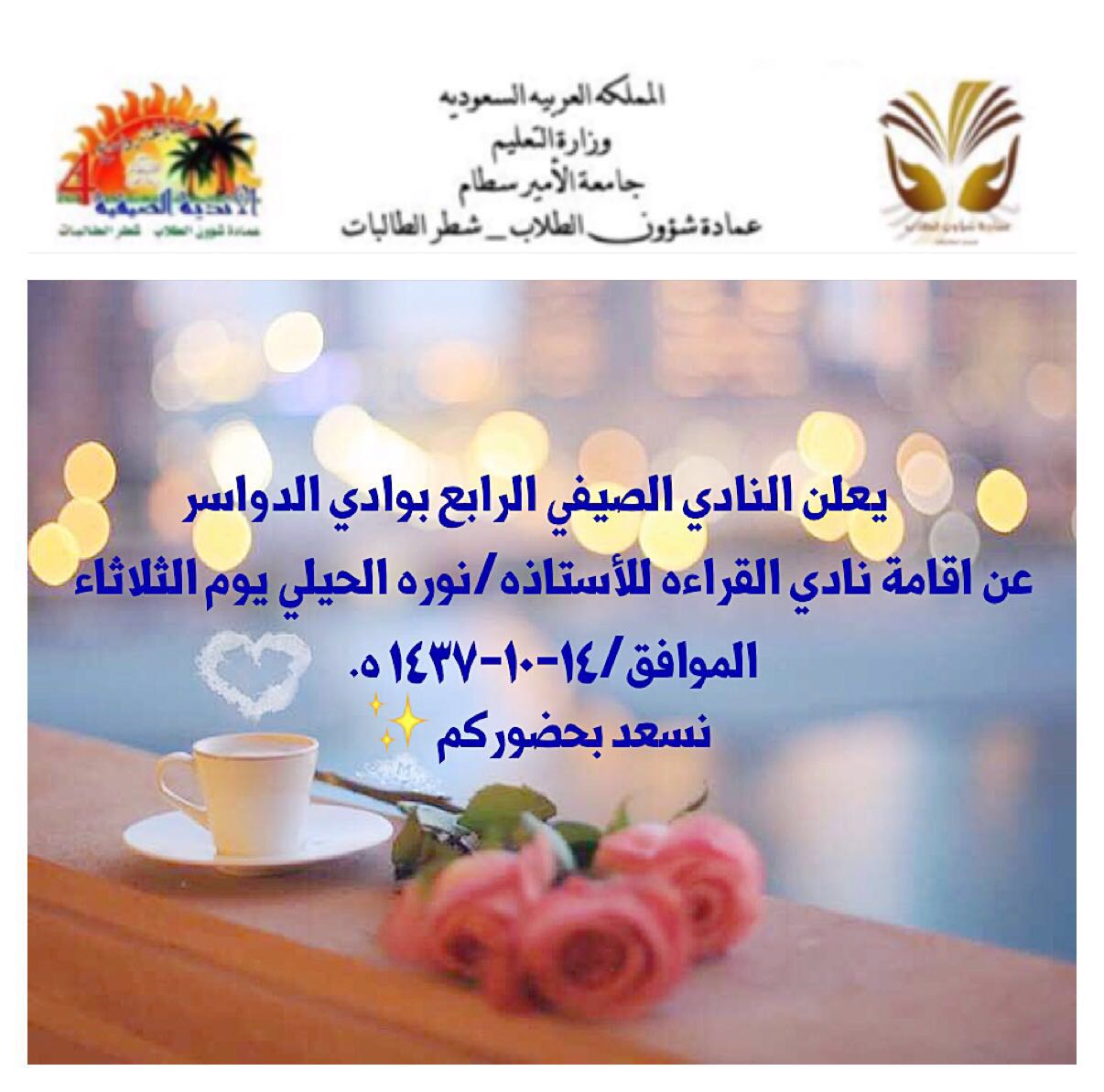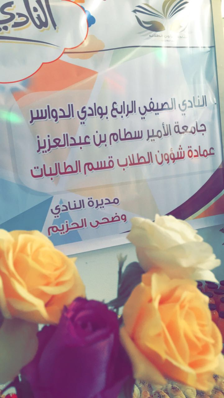 تحت رعاية عميد كلية الآداب والعلوم بوادي الدواسرالدكتور سفر بخيت المدرع، وبمتابعة ودعم من قسم الطالبات بعمادة شؤون الطلاب، انطلقت فعاليات النادي الصيفي الرابع، يوم الأحد ١٤٣٧/١٠/١٢.