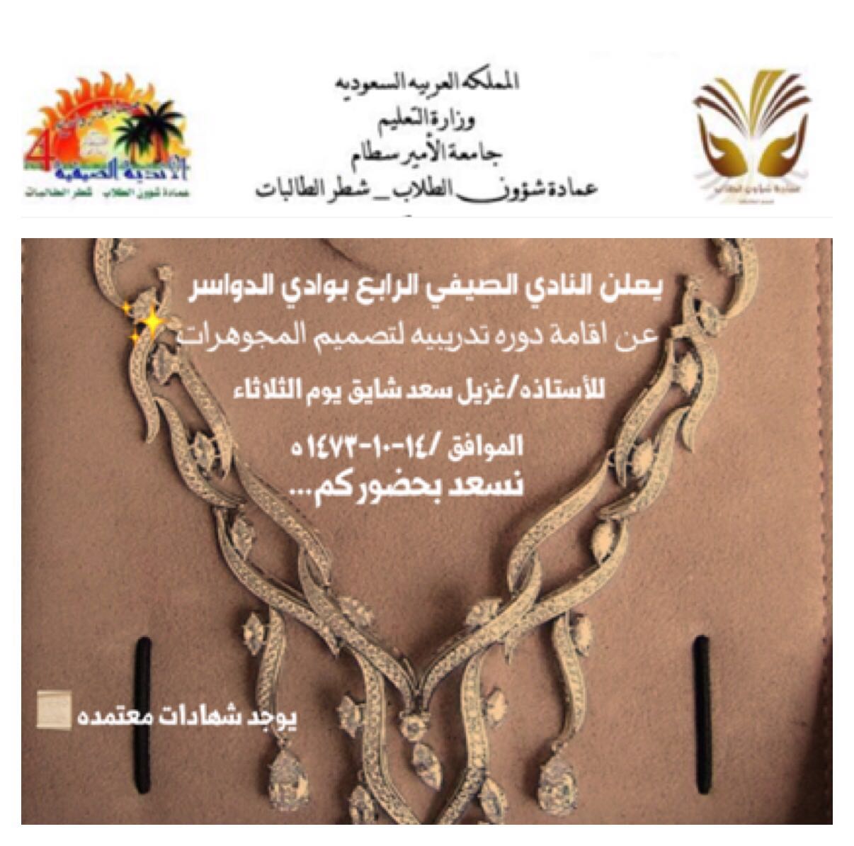 كما في يوم الثلاثاء ١٤٣٧/١٠/١٤ عقدت (دورة لتصميم المجوهرات)، قدّمتها الأستاذة غزيل شايق. وأدارت الأستاذة نورة الحيلي (نادي القراءة)؛ تعزيزًا وتنميةً لهذه المهارة الثقافية.