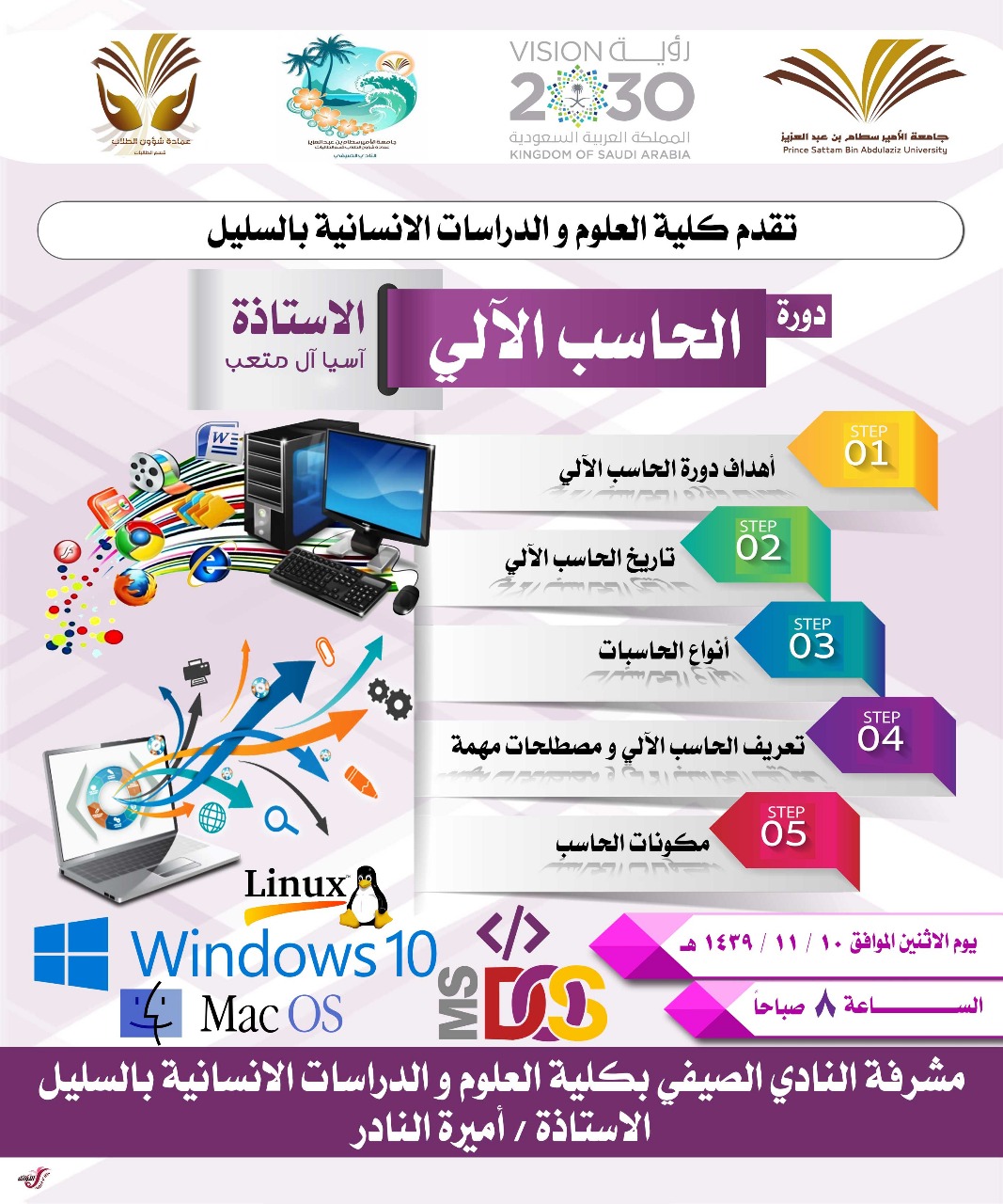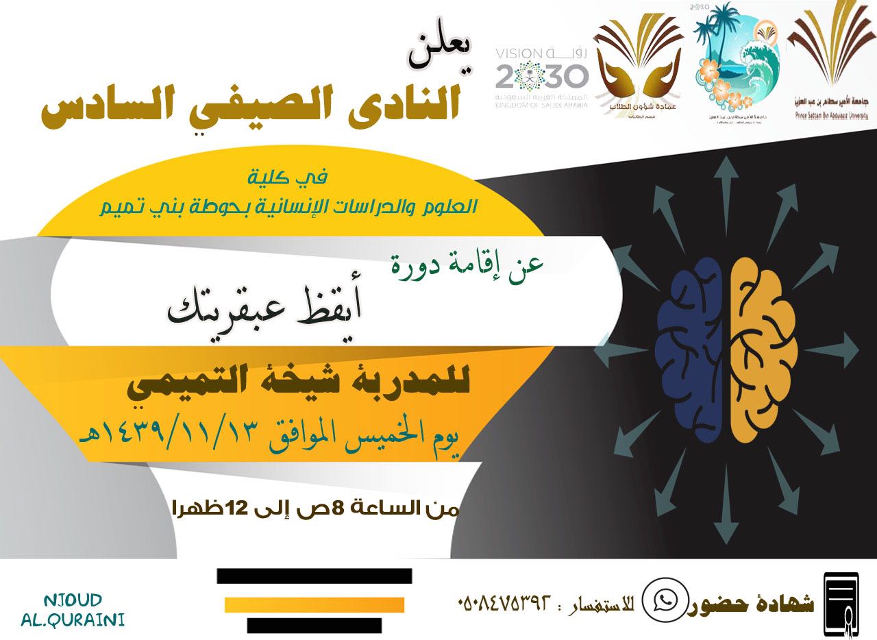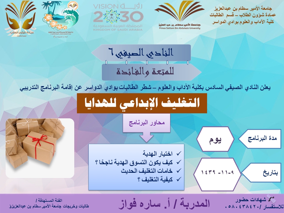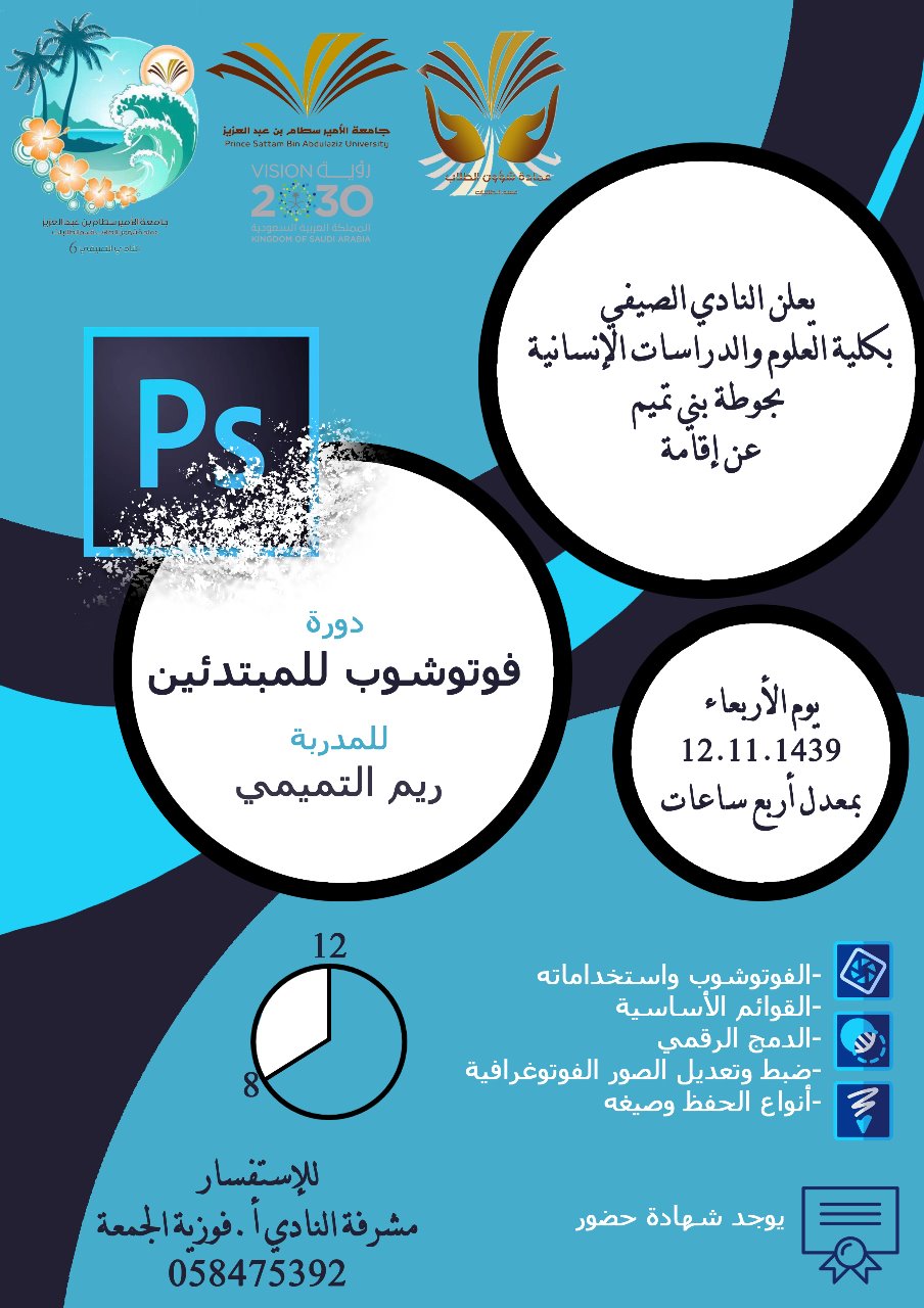 وبدأ نادي حوطة بني تميم فعالياته يوم الأحد 9/ 11 بالبرنامج التدريبي "قرارك يصنع مستقبلك"، وقدمته المدربة منار الموينع مستهدفة تقديم أساسيات في ريادة الأعمال، وبيان الفرق بين ريادة الأعمال والتجارة. وقدّمت المدربة نجود القريني البرنامجَ التدريبيَّ "كيف أتطوّع بموهبتي"، يوم الإثنين 10/ 11، بيّنت فيه مفهوم التطوّع في حياتنا، وأهميته. ويوم الثلاثاء 11/ 11 عقد البرنامج التدريبي "أساسيات التصوير"، درّبت فيه المدرّبة رناد التميمي المشاركات على أساسيات التصوير وأنواع الكاميرات، والطريقة الصحيحة لحمل الكاميرا، وأنواع الإضاءات بالاستديو. وقدّمت المدربة ريم التميمي برنامجًا تدريبيًّا على "فوتوشوب" للمبتدئين، يوم الأربعاء 12/ 11، للتعريف به وباستخداماته، ومعرفة معالجة الصور وضبطها، ومعرفة طرق الدمج وأنواعه. وختمت فعاليات النادي يوم الخميس 13/ 11 بالبرنامج التدريبي "أيقظ عبقريتك"، الذي قدّمته المدربة شيخة التميمي، لتعريف المشاركات بأساليب التعامل وتجاوز الصعوبات، والتعريف بمهارات التفكير الإبداعي. واستهل نادي الأفلاج أسبوعه الثاني بالبرنامج التدريبي "تعليم اللغة الإنجليزية"، الذي قدمته المدربة رفعة عويس، على مدى ثلاثة أيام: الأحد والإثنين والثلاثاء 9 -11/ 11، استهدفت تحسين المهارات في المحادثة والاستماع والنطق الصحيح، واختيار الكلمات والمفردات والتعابير والنحو وبناء الجمل الصحيحة بالمحادثة، والتعرّف إلى الأخطاء اللفظية وتصحيحها. ويومي الإثنين والثلاثاء 10، و11/ 11 عقد البرنامج التدريبي "الرسومات البيانية باستخدام (spss)"، وقدّمته المدربة أفراح الرزامي، للتعريف بالبرنامج الإحصائي (spss)، والتعامل والتحكم بالبيانات. وقدّمت المدربة منى البشر البرنامج التدريبي "حيث أكون"، يوم الأربعاء 12/ 11، مستهدِفًا تعليم المشاركات على السعي للتميز، وتحديد الأهداف، وترتيب الأولويات. وختم النادي فعالياته يوم الخميس 13/ 11 بالبرنامج التدريبي الوطني "مواطنة امرأة"، الذي قدّمته المدربة لطيفة القرون، واستهدف التعريف بمصطلح المواطنة لغةً واصطلاحًا، وتبيان مكانة المملكة العربية السعودية في العالم الإسلامي، ودورها في خدمة المعتمرين والحجاج، ودور المرأة السعودية في تعزيز المواطنة في المجتمع والأجيال القادمة. واستهلَّ النادي الصيفي بالسليل أسبوعه الثاني يوم الأحد 9/ 11، بالبرنامج الثقافي "التسوق الإلكتروني الآمن"، وقدمته المدربة نادية الفاران، واستهدف تعريف المشاركات بأهمية التسوق الإلكتروني، وإيجابياته وسلبياته، وكيفية التعامل به. وقدّمت المدربة آسيا المتعب برنامجًا تدريبيًّا في الحاسب الآلي مدته 10 ساعات، قسمته على يومين، فتضمّن التدريب يوم الإثنين 10/ 11 استخدام بعض البرامج اليومية، مثل: معرفة عمل عرض تقديمي (بوربوينت)، والتعامل مع الرسائل في برنامج (outlook 2010)، ومعرفة تحرير النصوص وتنسيقها، وحفظ الملف وطباعته. وتضمن يوم الثلاثاء 11/ 11 التدريب على برامج أخرى، مثل: استخدام لوحة مفاتيح الحاسب بطريقة اللمس بسرعة لا تقل عن 20 كلمة صحيحة في الدقيقة، وتنسيق الرسائل والجداول باستخدام برنامج (Word)، واستخدام الإنترنت (Explorer). وفي يوم الأربعاء عقد البرنامج التدريبي "التصوير الاحترافي"، الذي قدّمته المدربة شيخة الجابر، واستهدف تعليم المشاركات كيفية تصوير اليوميات، واستخدام الإضاءة في التصوير وأنواعها، واختيار زاوية التصوير، ونوع الكاميرات والعدسات. وختم فعاليات النادي فعالياته يوم الخميس 13/ 11، بعقد أصبوحة ثقافية تفاعلية "من رائحة الجنة"، قدمتها: رشا محـمد، وربى متعب، استهدفت تعليم المشاركات التعامل مع الوالدين، وبرّهما، وإدخال السرور عليهما. وبدأ النادي في وادي الدواسر يوم الأحد 9/ 11 بالبرنامج التدريبي "سويعات في رحاب القرآن"، وقدّمته خديجة العمري، تدربت خلاله المشاركات على تعرّف الطريقة الصحيحة لتلاوة القرآن، تقرّبًا إلى الله بتلاوة كتابه وتدبّره وتعلّمه. وأعقب ذلك برنامج تدريبي، قدمته المدربة س