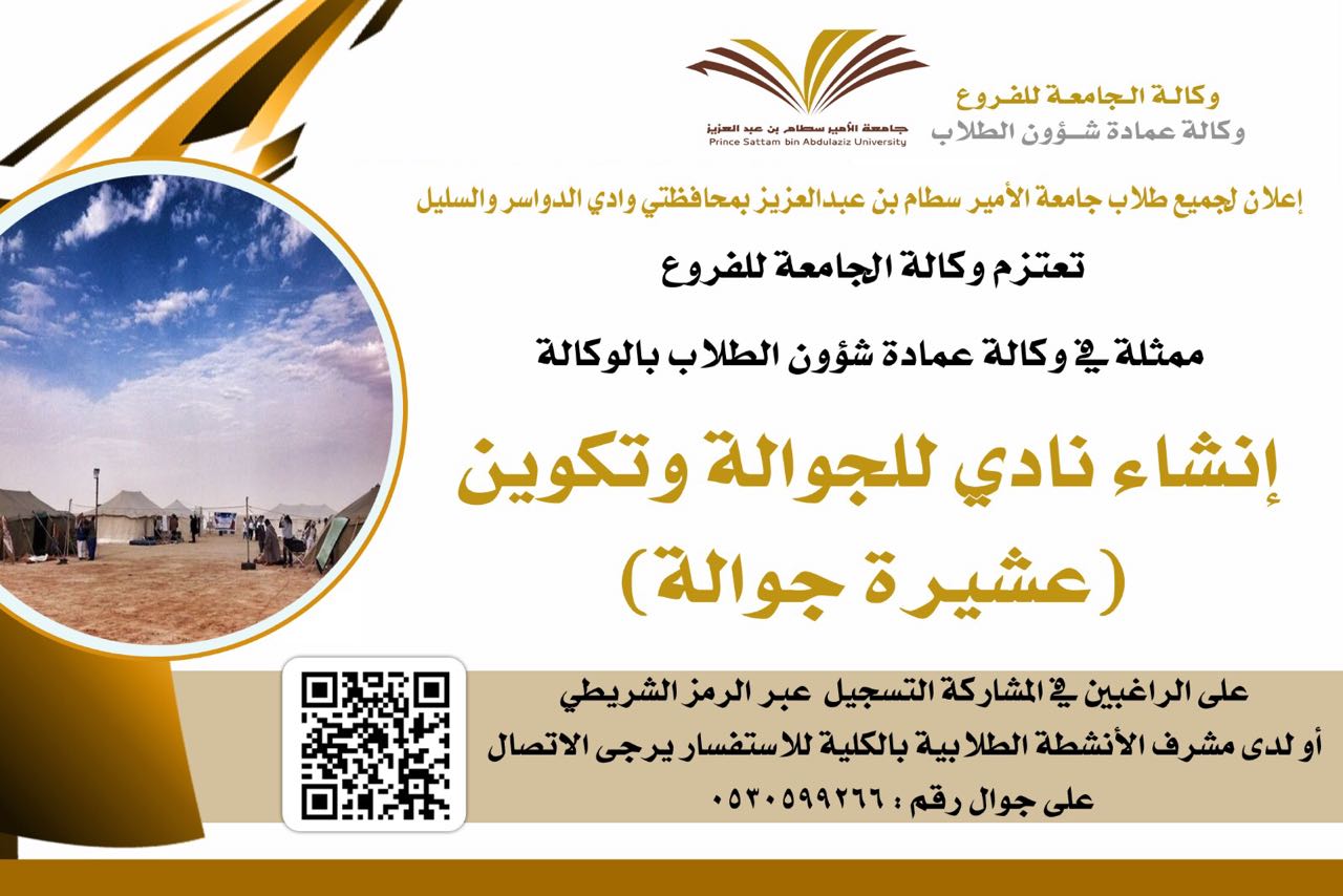 تعتزم وكالة الجامعة للفروع ممثلة في وكالة عمادة شؤون الطلاب بالفروع القيام بتكوين ( عشيرة الجوالة ) وذلك لطلاب كليات وادي الدواسر والسليل
