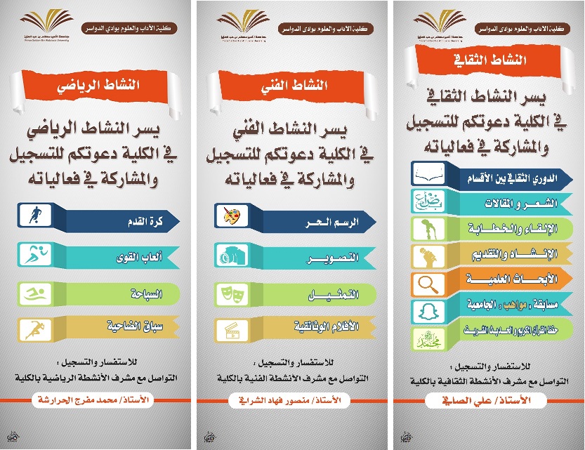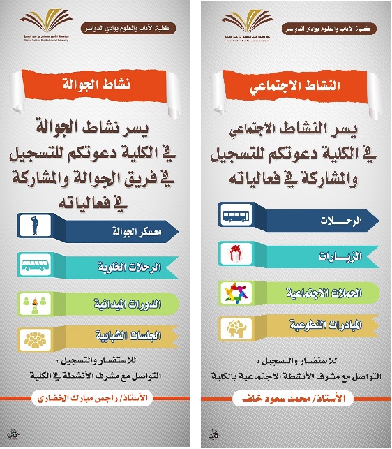 تعلن كلية الآداب والعلوم بوادي الدواسر عن فتح باب التسجيل في الأنشطة الطلابية للعام الدراسي 1438هـ ـ1439هـ وأوضح المشرف على الأنشطة الطلابية بالكلية الأستاذ راجس بن مبارك الخضاري عضو هيئة تدريس بالكلية أن الهدف من التسجيل في مجال الأنشطة الطلابية هو تحقيق تميز نوعي في اكتشاف مواهب الطلبة وقدارتهم وتنمية الطاقات المبدعة والخلاقة لديهم وإيجاد بيئة خصبة للإبداع والابتكار عند الطلبة والمشاركة في تكوين شخصية الطالب ، واكتشاف قدراتهم ومواهبهم وتنميتها والقضاء على أوقات الفراغ لدى الطالب بأعمال نافعة تقوده إلى تحقيق أهدافه .