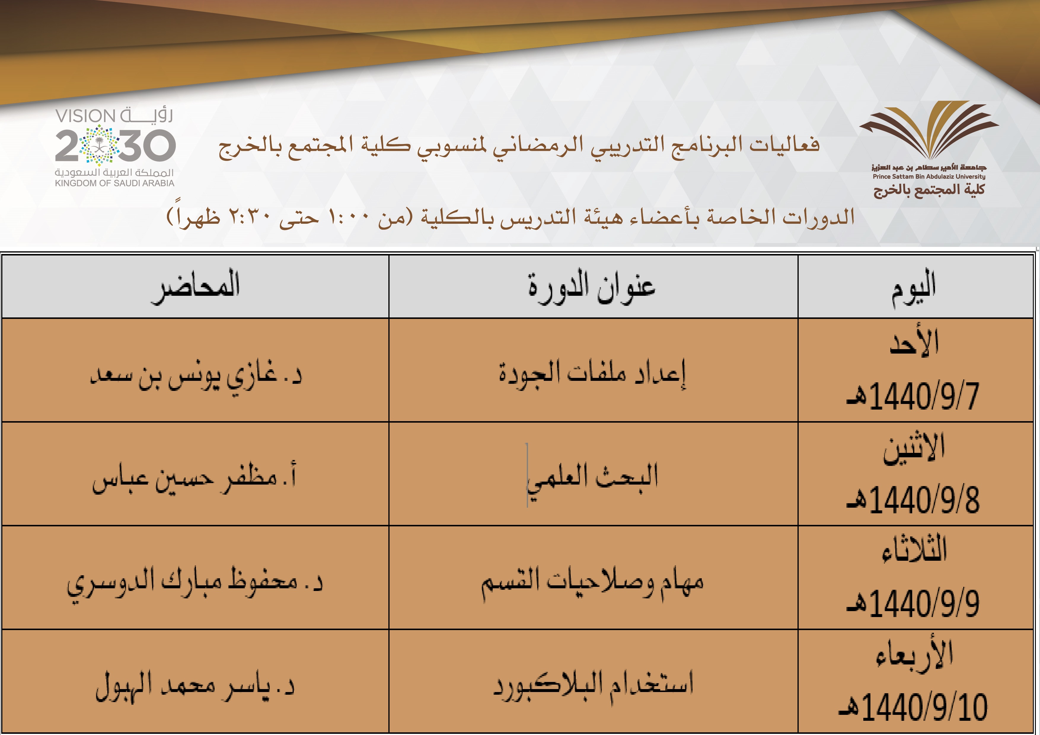 في إطار مساعي كلية المجتمع بالخرج الحثيثة ووفق رسالتها الفاعلة لتحقيق رؤيتها وأهدافها الإستراتيجية ؛ انطلقت اليوم الأحد 7/9/1440هـ بتوجيه من سعادة عميد الكلية د. حمد بن عبدالله القميزي فعاليات البرنامج التدريبي الرمضاني لرفع كفاءة الأداء، وتطوير المهارات، والذي يستهدف منسوبي الكلية (أعضاء هيئة التدريس -الموظفين)، ليكون ختام العام الجامعي حافلاً بالنشاطات الفاعلة. ويستغرق البرنامج أسبوعاً كاملاً، وينقسم إلى فئتين: دورات مقدمة للموظفين، ودورات أخرى للأكاديميين، والتي يقدمها أعضاء هيئة التدريس بالكلية، وأشار سعادة عميد الكلية د. القميزي إلى أن برنامج تدريب الموظفين ركز على أهم الأساسيات والكلمات والجمل التي يحتاجها الموظف في حياته الوظيفية العملية باللغة الإنجليزية، كما أنها سوف تساعدهم على التعامل مع المواقف الحياتية التي يمرون بها في أماكن العمل والأماكن العامة.