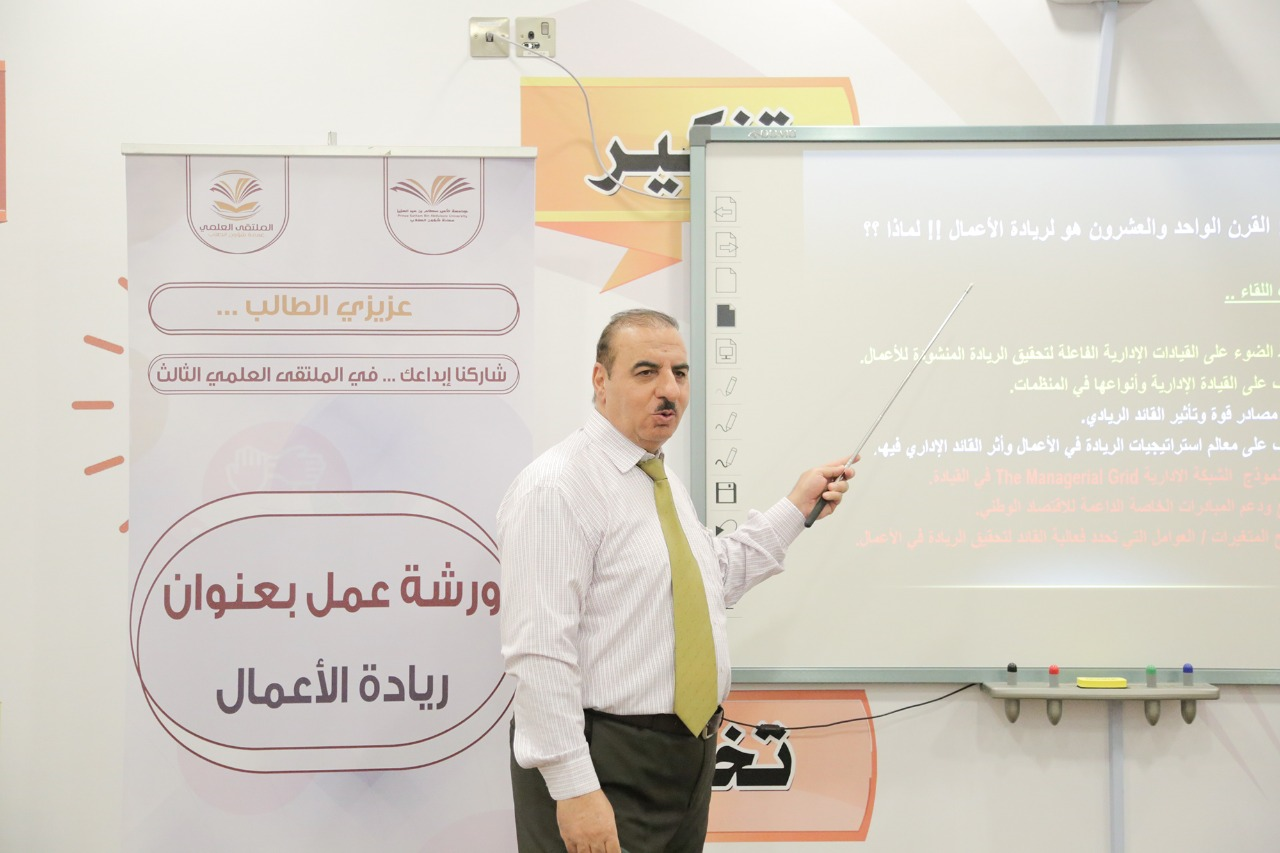 ضمن استعدادات كليات الجامعة بالأفلاج للملتقى العلمي الثالث نظم نادي ريادة الأعمال يوم الأربعاء الموافق 1440/5/24 هـ، ورشة عمل تحت عنوان "القيادة في ريادة الأعمال" قدمها الدكتور أنس عبدالباسط عباس عضو هيئة التدريس بقسم إدارة الأعمال ، وحضر الورشة أكثر من ثلاثين مشاركاً ، وتمثلت أهداف الدورة العمل على غرس ثقافة الريادة في المجتمع وتشجيع ودعم المبادرات الخاصة الداعمة للاقتصاد الوطني وتهيئة قيادات إدارية فاعلة في المجتمع تستطيع مواجهة المستقبل، ويمكنها استغلال الموارد المادية والبشرية المتاحة والتنبؤ بالمتغيرات الإقليمية والدولية المحيطة بعالم الأعمال والاستعداد المدروس لتجاوز العقبات المحتملة.