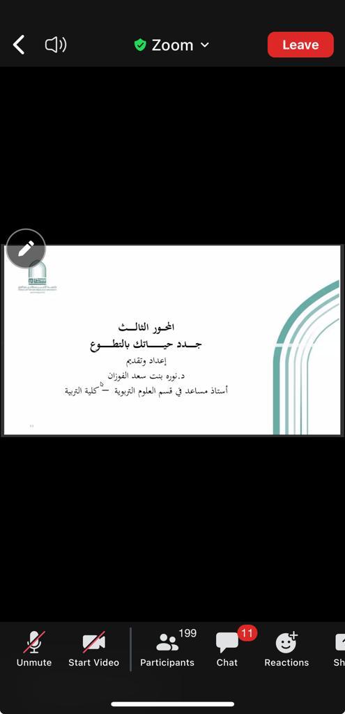 وفي المحور الثالث قدمت د. نورة الفوزان مجالات العمل التطوعي والتي من أنواعها: التطوع الفكري والتطوع العلمي والتطوع الصحي والتطوع البيئي والتطوع الرقمي والرياضي. كما تناولت منظمات وجمعيات العمل التطوعي المحلية والعالمية.