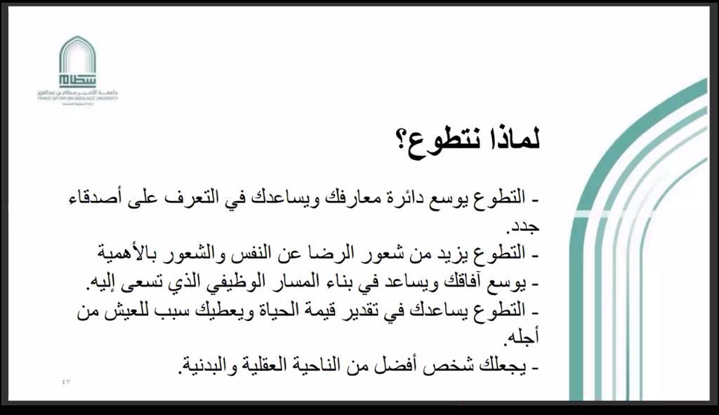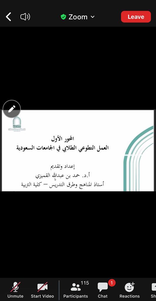 في بداية الندوة أوضح د.حمد القميزي مفهوم العمل التطوعي في ضوء رؤية 2030 والذي يهدف إلى تحويل المملكة إلى مجتمع حيوي ومزدهر ومتطور كما بيّن أهمية العمل التطوعي في المرحلة الجامعية وعن واقع العمل التطوعي الطلابي في الجامعات السعودية ، والتطلعات المأمولة من مشاركة طلبة الجامعات السعودية في العمل التطوعي.