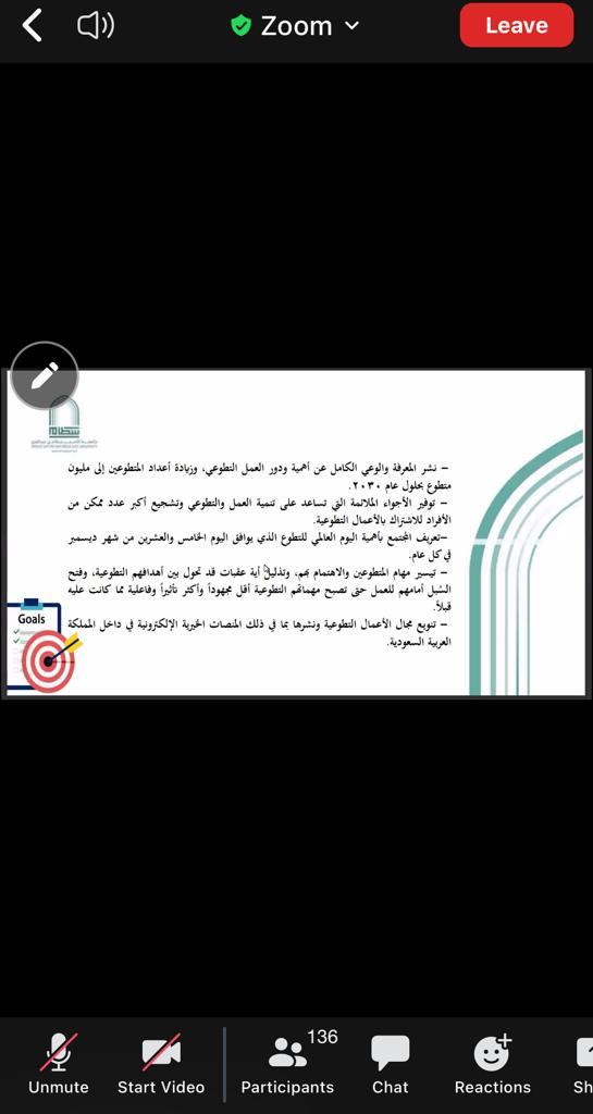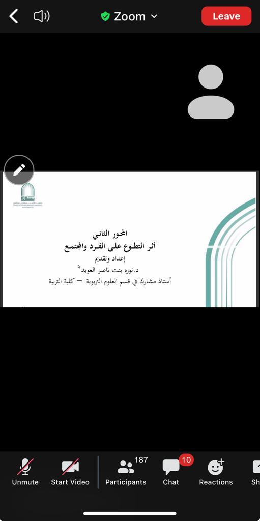 وفي المحور الثاني قدمت د. نورة العويد أنواع التطوع وفوائده ومدى تأثيره في تحسين جودة الحياة وتعزيز الشعور بالانتماء وخلق بيئة صحية اجتماعياً.