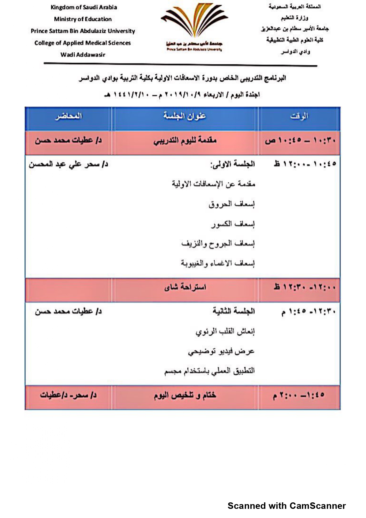 قد يواجه الإنسان ظروفًا ومواقف حرجة تُفرض علية فجأةً ودون سابق إنذار. وعندما يكون لدى الإنسان المعرفة والدراية بكيفية التصرف في مثل هذه الظروف والمواقف الطارئة فإن ذلك قد ينقذ حياة إنسان ، تلك الحياه التي لا تقدر بثمن . وفي إطار ذلك ومن منطلق أهمية تثقيف أفراد المجتمع وجعلة اكثر أدراكاً ووعياً بضرورة حسن التصرف في مثل هذه الحالات وثقة الفرد بقدرته على تقديم المساعدة وإسعاف الأخرين ، أُقيمت في يوم الأربعاء الموافق 10/2/1441هـ بكلية التربية بوادي الدواسر - الندوة التثقيفية والتدريبية للإسعافات الأولية - تحت إشراف وحدة خدمة المجتمع ووحدة العمل الطلابي وبالتعاون مع كلية العلوم الطبية التطبيقية . وقد تضمنت أجندة الندوة عدة محاور توعوية وتدريبية نُوقشت خلال جلستين قدمتهما كلا من الدكتورة / سحر علي عبدالمحسن والدكتورة / عطيات محمد حسن عضو بكلية العلوم الطبية والتطبيقية . عُرض خلالها مجموعة من الأفلام والصور التوعوية هَدُفت إلى رفع مستوى الوعي الطبي وأهمية الإسعاف الأولية في منع حدوث الوفاة أو التدهور الصحي أو الإصابات الخطيرة .