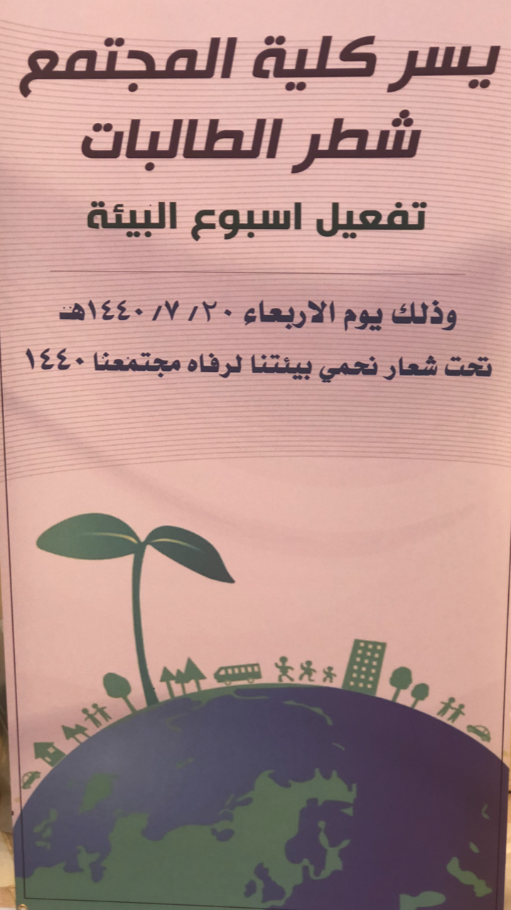 بمناسبة أسبوع البيئة العالمي وتحت رعاية سعادة وكيلة كلية المجتمع بالخرج الدكتورة/ أمينة بنت عبدالرحمن المشحن. أقامت وحدة العمل الطلابي بالكلية بالتعاون مع جمعية " نحن صوتهم " و" حديقة سومي " فعالية " نحمي بيئتنا لرفاه مجتمعنا " يوم الأربعاء الموافق 20/7/1440هـ في ساحة الكلية وذلك لتفعيل أسبوع البيئة العالمي عن طريق تعزيز مفهوم المحافظة على البيئة لدى منسوبات الكلية وتم استضافة طالبات مدارس الجامعة المرحلة المتوسطة. حيث اكتست ساحة الكلية وممراتها باللون الأخضر وتم إعداد عدد من الأركان المتنوعة التي تعزز مفهوم المحافظة على البيئة كماتم استضافة المدربة / أسماء احمد السليمان من حديقة سومي في لقاء تحدثت فيه مع الطالبات عن طريقة الاهتمام بالنباتات والطرق الصحيحة للزراعة وأهمية الزراعة ونشر الثقافة الزراعية بين أفراد المجتمع وتوعية الطالبات بالمخاطر التي قد تصيب النباتات وطرق الوقاية منها . كما شاركت جمعية نحن صوتهم بإبراز دور الجمعية وهدفها في بناء مجتمع خال من العنف ضد الحيوانات. ونشر الوعي في المجتمعات للمحافظة على البيئة وتم إقامة عرض مرئي يوضح ذلك