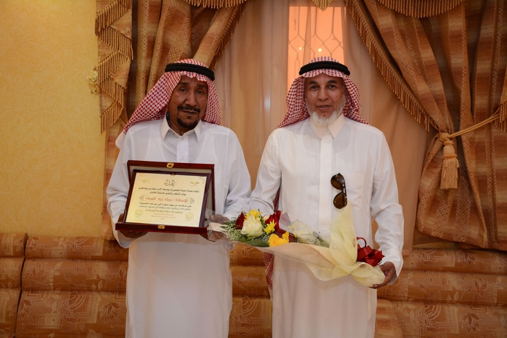 وبلفتة جميلة قام الوفد بزيارة إلى المعلم الفاضل الأستاذ المتقاعد : بريك بن زيد البريك في منزله ، تقديراً له على ما بذله في مجال التربية والتعليم ، راجين الصحة والعافية له ، مقدمين له درعا تذكاريا .