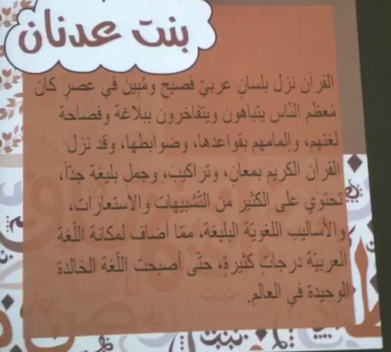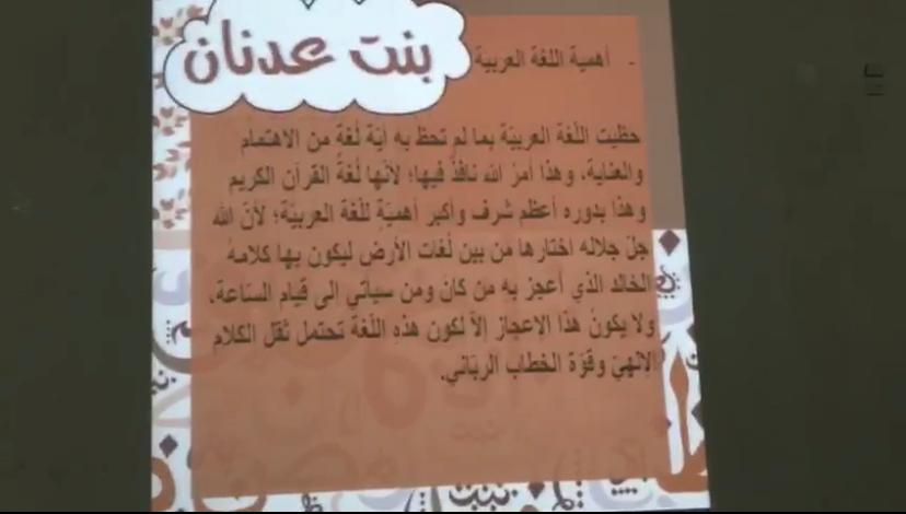 قال الله تعالى: (وَلَقَدْ نَعْلَمُ أَنَّهُمْ يَقُولُونَ إِنَّمَا يُعَلِّمُهُ بَشَرٌ ۗ لِّسَانُ الَّذِي يُلْحِدُونَ إِلَيْهِ أَعْجَمِيٌّ وَهَٰذَا لِسَانٌ عَرَبِيٌّ مُّبِينٌ). نظراً لأهمية اللغة العربية من أنها أحد مكونات المجتمع والثقافات وتمثل خصائص الأمة وهي أعظم وسائل التواصل بين الناس أقام نادي العلوم الأساسية في عمادة السنة التحضيرية – قسم الطالبات دورة بعنوان بنت عدنان يوم الأحد الموافق 1441/6/22هـ تحت إشراف الأستاذة اقبال أحمد وذلك في مسرح العمادة. وتضمنت الدورة إلقاء شعري عن اللغة العربية و عرض توضيحي بينت فيه أهمية اللغة العربية وحيث أنها تحمل رسالة إنسانية بمفاهيمها وأفكارها وتم توزيع مطويات عن أهمية اللغة العربية على الطالبات والأستاذات.