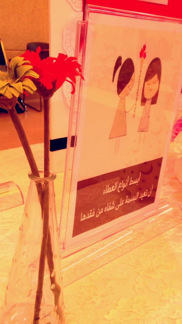 وقد تم توزيع منشورات وتوزيعات تحوي على كلمات معبرة وهادفة عن العطاء وأهميته ، وكانت الفعالية من تنظيم الطالبات: مجد الكلثم- نجوى طيب- شروق علي، مرام آل ثابت