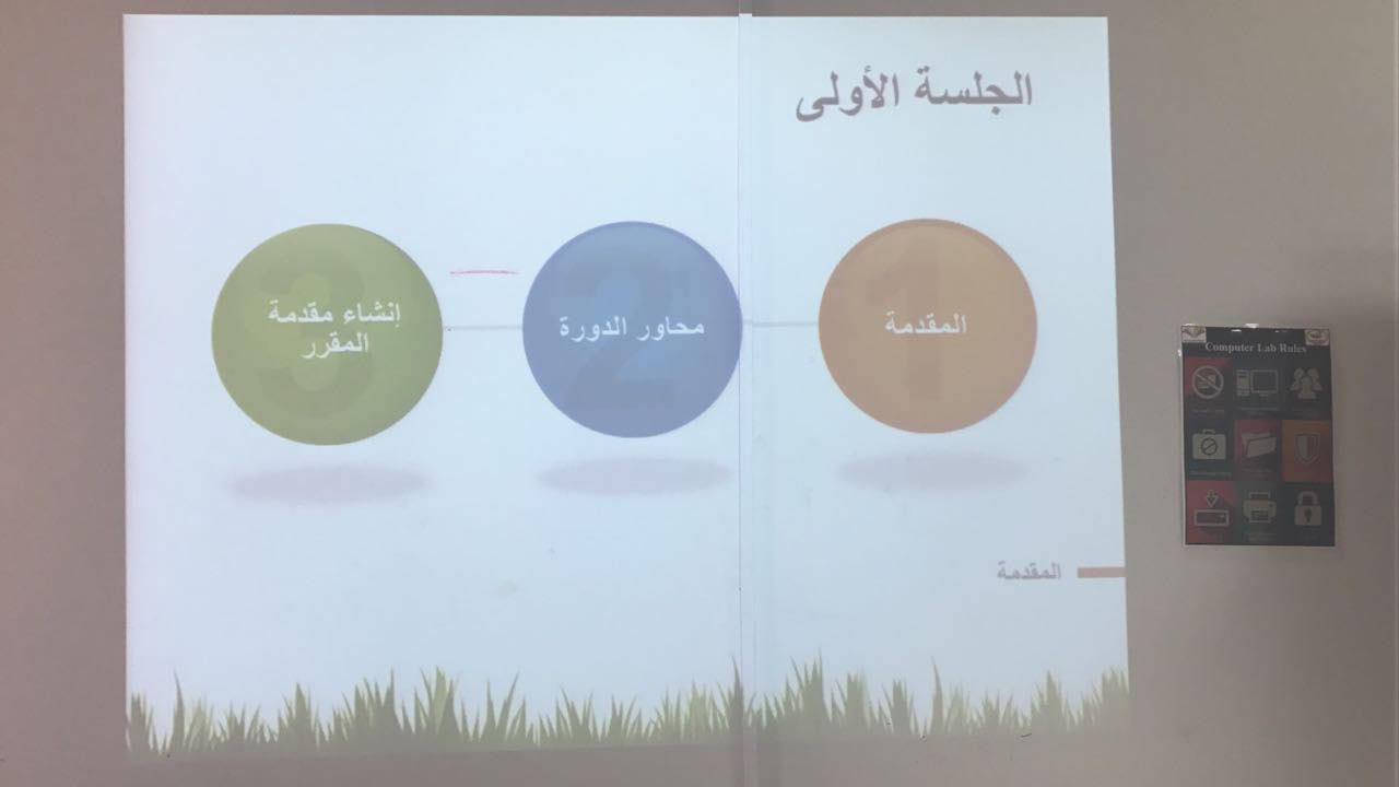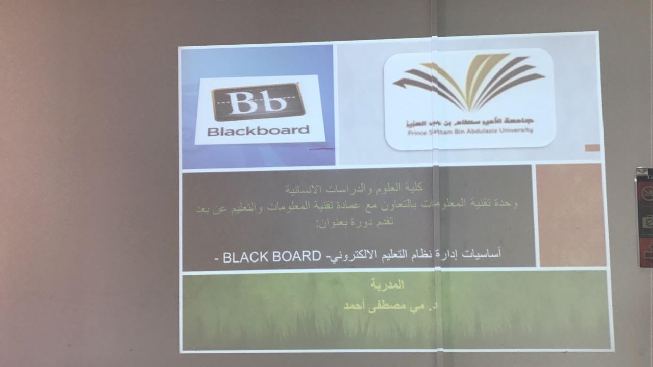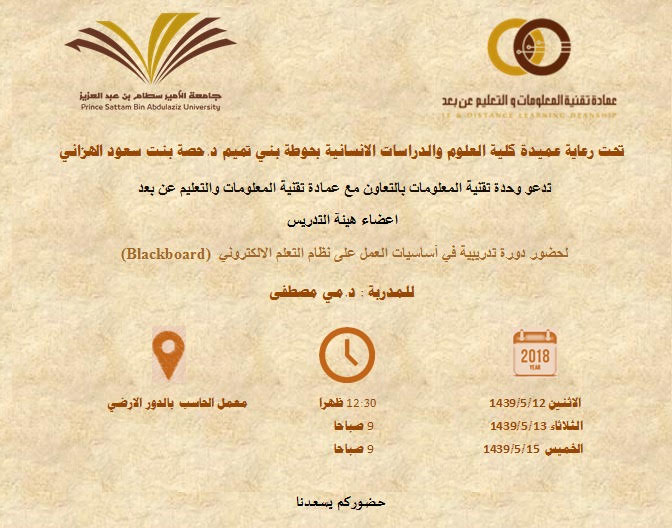 برعاية عميدة كلية العلوم والدراسات الانسانية بحوطة بني تميم، نفذت وحدة تقنية المعلومات بالكلية بالتعاون مع عمادة تقنية المعلومات والتعليم عن بعد بتنظيم دورة أساسيات التعليم الالكتروني (blackboard) موجهة لأعضاء هيئة التدريس من تقديم مساعدة العميدة للشؤون التعليمية والأكاديمية الدكتورة مي مصطفى ) مدرب معتمد من عمادة تقنية المعلومات والتعليم عن بعد) في معمل الحاسب بالكلية. ابتدأت الدورة في يوم الاثنين الموافق 12 / 5 / 1439 هـ وتستمر لمدة ثلاثة أيام. تم خلال الدورة التعريف بالتعليم الالكتروني(Blackboard)،طريقة الدخول له عن طريق جهاز الحاسب، الصفحة الشخصية للمحاضرة في نظام التعليم الالكتروني، كيفية عمل حلقات النقاش والاختبارات، تغير الواجهة والسمات الاخرى المتعلقة بمقرر معين، التعرف على كيفية وضع الواجب وإضافة عمود للدرجات، واخيراً التعرف على حلقات النقاش وكيفية عملها. كما تم تطبيق في الجزء الأول من الدورة معايير الجودة الخاصة بالمقررات الالكترونية بداية بمقدمة المقرر حسب التوجيه من قبل وكيلة عمادة تقنية المعلومات والتعليم عن بعد.