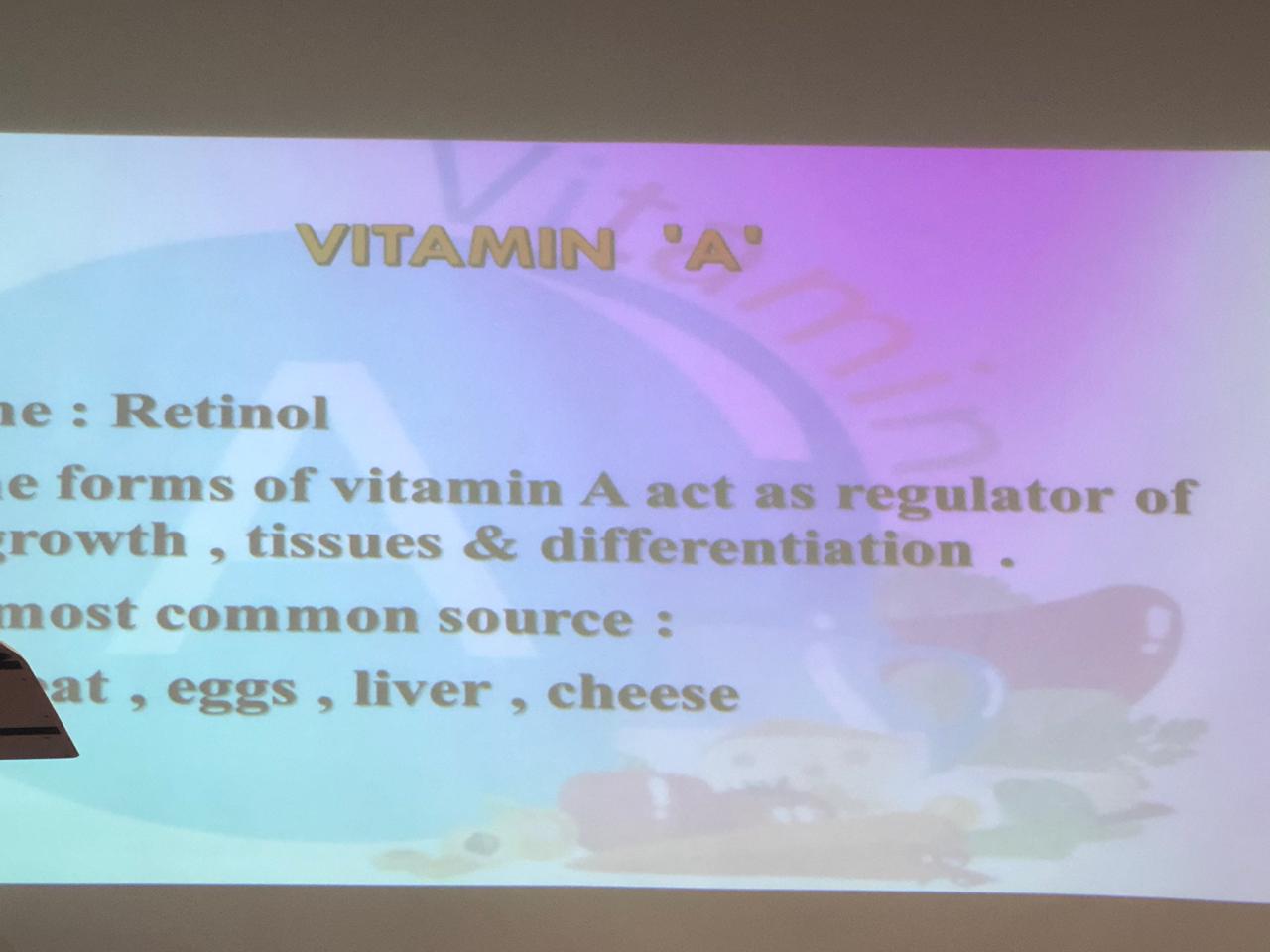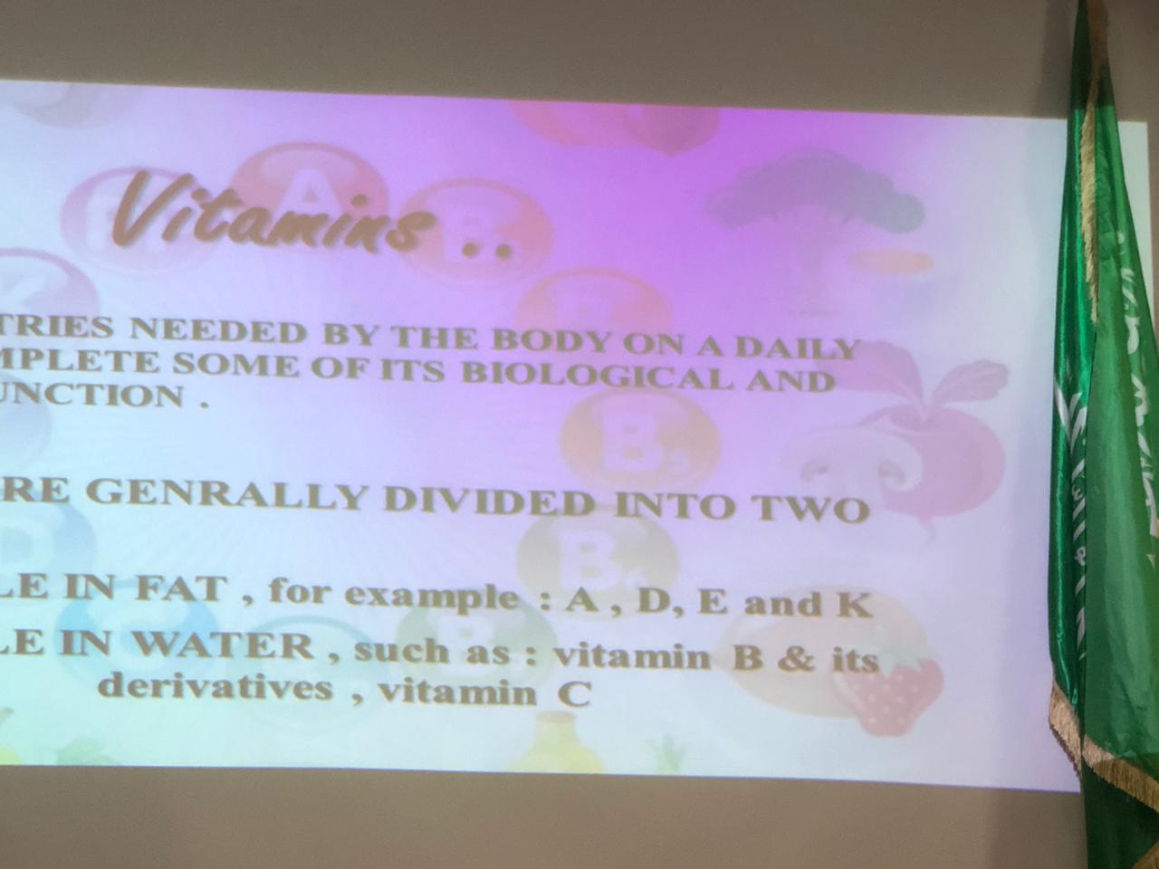 قدم قسم الكيمياء بكلية العلوم والدراسات الانسانية بحوطة بني تميم فعالية بعنوان "الفيتامينات وفوائدها" يوم الخميس الموافق 23 / 6/ 1440هـ في تمام الساعة ٩:١٥ في مسرح الكلية. ركز البرنامج على التعريف بالفيتامينات واهميتها وفوائدها كلاً على حده، ومن بينها فيتامين د وهو من اهم الفيتامينات شهرة حالياً على مستوى المجتمع وعواقب نقصه على الجسم. كما تضمن البرنامج توزيعات تحتوي على معلومات عن الفيتامينات. البرنامج تحت إشراف لمياء آل سالم منسقة النشاط في قسم الكيمياء.