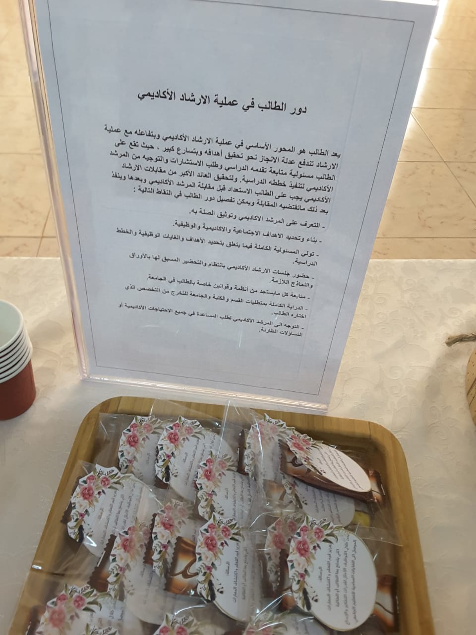 كما نظم قسم الدراسات الاسلامية ركن تعريفي بالإرشاد الاكاديمي استهدف طالبات المستوى الأول، وذلك لتعريفهن بالأنظمة واللوائح التي تهمها في مسيرتها الدراسية، واحتوى الركن على كتيبات في الارشاد الاكاديمي وتوزيعات ومطويات تساعد الطالبة على فهم ومعرفة دورها في الارشاد الآكاديمي. كان ذلك بمشاركة طالبات المستوى الخامس وإشراف الأستاذة إسلام فرح.