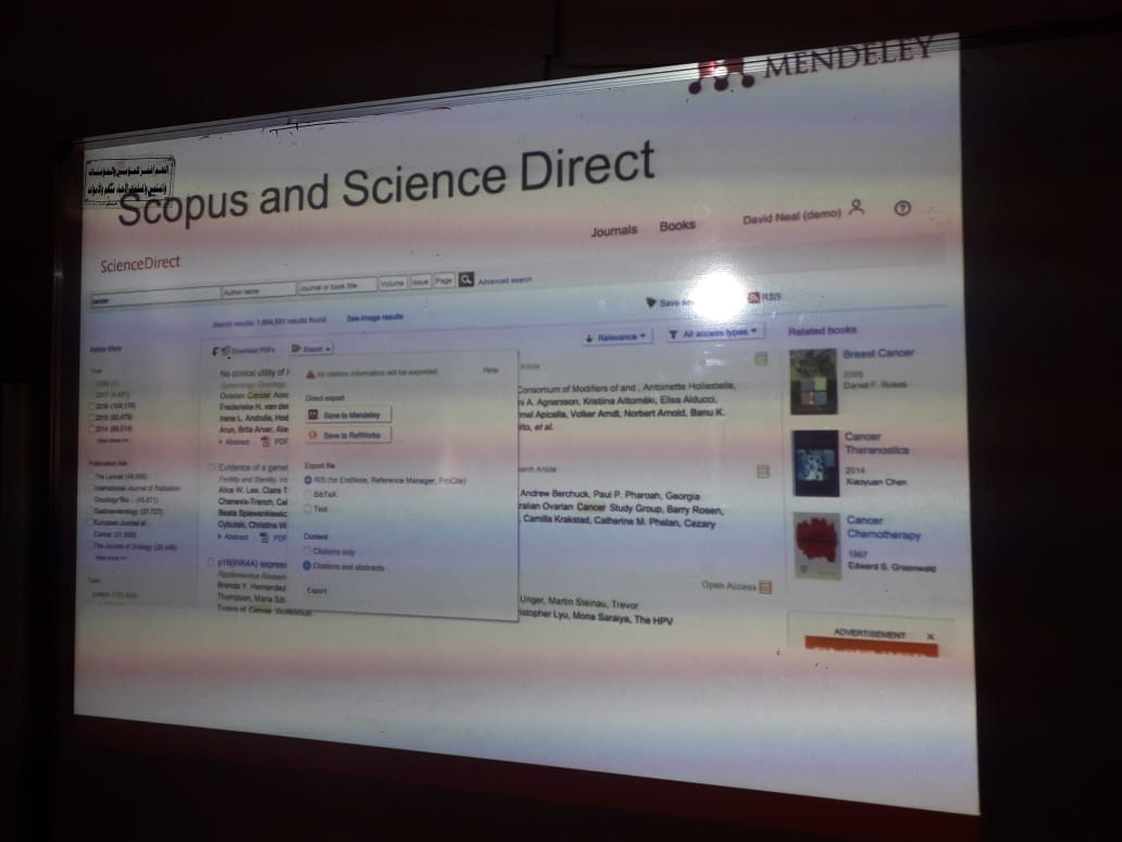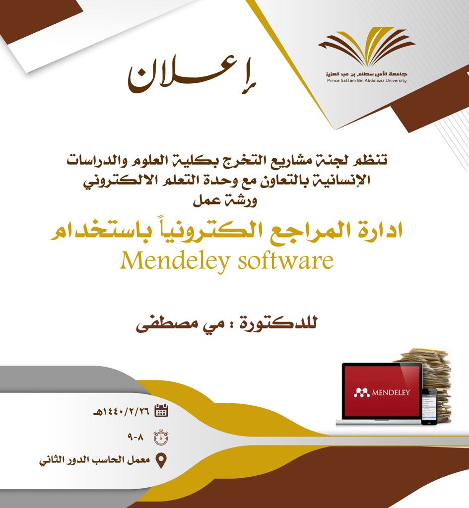 وفي السياق ذاته بالتعاون مع لجنة مشاريع التخرج بالكلية، تم عقد ورشة عمل تدريبية بهدف تعريف طالبات مقرر مشروع تخرج 1 بكيفية توثيق الدراسات السابقة ذات الصلة بالمشروع التي تمت خلال المسح الأدبي بكتابة المراجع الكترونياً باستخدام Mendeley Software . كان ذلك في يوم الأحد الموافق 26/02/1440هـ في معمل الحاسب الآلي أ(1-2A) وهدفت الورشة إلى: