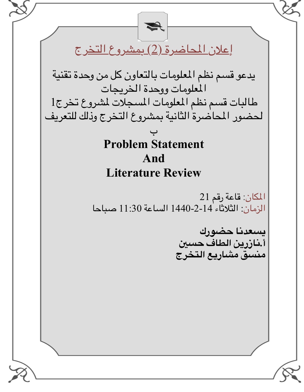 تم تنسيق وتقديم هذه المحاضرة من قبل أ.نازرين الطاف حسين منسق مشاريع التخرج وبإشراف ومتابعة رئيسة قسم نظم المعلومات بالكلية الدكتورة هبة الله الويشي من أجل تحقيق الأهداف المنشودة منها. تهدف هذه المحاضرة إلى تهيئة الطالبات المسجلات في مقرر مشروع التخرج للعمل على اتمامه ورفع مستوى الفهم والاستيعاب لديهم حيث تم خلالها الرد على استفسارات الطالبات ومتابعه عملهم في المشروع.