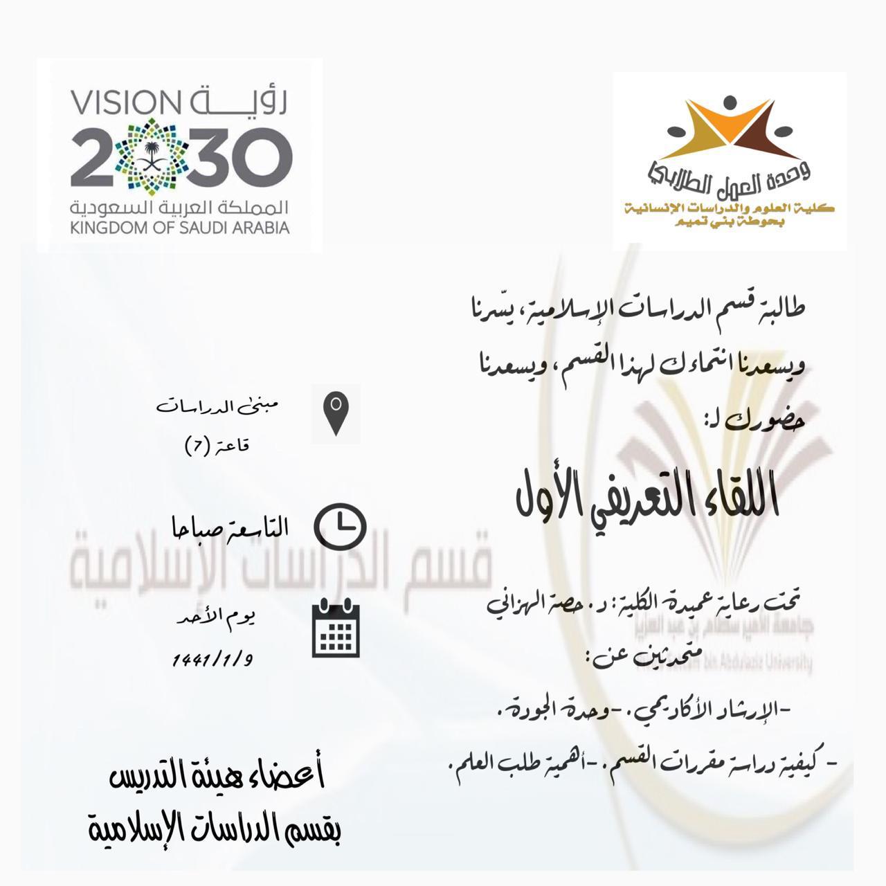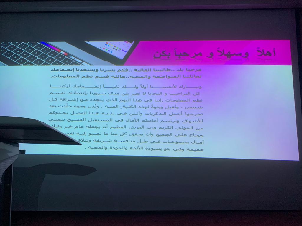 في بداية عام دراسي حافل ، وبغرض الترحيب بالطالبات المستجدات وتعرفيهن بالأقسام وبأنظمة الجامعة، قدمت كلية العلوم والدراسات الإنسانية بحوطة بني تميم برامج منوعة لاستقبال الطالبات وتهيئتهن تحت رعاية عميدة الكلية د. حصة بنت سعود الهزاني ، وبحضور رئيسات الأقسام وأعضاء هيئة التدريس والطالبات المستجدات، افتتحت هذه البرامج بتقديم قسم الكيمياء حفل استقبال المستجدات للقسم يوم الأحد : الموافق 9/ 1 / 1441هـ في مسرح الكلية، كما قدم قسم الدراسات الإسلامية اللقاء التعريفي الأول للطالبات المستجدات بقاعة (٧) بمبنى الدراسات الإسلامية عند الساعة التاسعة صباحاً من اليوم ذاته. توالت اللقاءات التعريفية تباعاً في بقية أقسام الكلية ، حيث أقام قسم نظم المعلومات اللقاء التعريفي للمستجدات يوم الأثنين: الموافق 10/ 1 / 1441هـ في مسرح الكلية، تلا ذلك قسم اللغة العربية حيث استقبل منسوباته يوم الأربعاء: الموافق 11\1\1441هـ بمسرح الكلية. ركزت هذه اللقاءات على الترحيب بالطالبات المستجدات، و تقديم نبذة سريعة عن نشأة الكلية و رسالة الأقسام ورؤاهم المختلفة ومجالات العمل للخريجات. كما تم توضيح دور الإرشاد الأكاديمي ، وكیفیة الاستعانة بالمرشد الأكاديمي وخطة الدراسة لكل قسم، وأهمية الجودة ومشاركة الطالبة في تقییم العملية التعليمية. تخلل هذه اللقاءات كلمات توجيهية لرئيسات الأقسام عن ضرورة التزام الطالبات بالحضور وبكل المهام التي تقدم لهن ، والتقيد بأنظمة الكلية وعكس صورة إيجابية عن ذواتهن، وتشجيعهن على المشاركة في الأنشطة الطلابية. وفي الإطار ذاته، أقامت وحدتا العمل الطلابي و الإرشاد الأكاديمي لقاءات تعريفية مع الطالبات المستجدات بمسرح الكلية، هدفت اللقاءات التعريف بهذه الوحدات واللجان التابعة لها وأهمية كل لجنة وما تقدمه للطالبات ، حيث تكلمت رئيسة الإرشاد الأكاديمي عن أهم القضايا الأكاديمية التي تهم الطالبات ، وتناولت حقوق الطالبة وواجباتها وكل ما يخص الحياة الطلابية. كما تم التعريف بلجنتي الخدمة النفسية والاجتماعية والخدمات التي تقدمها اللجنة للطالبات والعمل على تحقيق الاستقرار النفسي والاجتماعي لهن.اختتمت هذه اللقاءات بشكر الجميع على الحضور ، والمشاركة بحوار مفتوح لاستقبال الأسئلة من الطالبات ولقاءات تعارف للمستجدات بأعضاء هيئة التدريس بالأقسام ، وتوزيع الأدلة الإرشادية الخاصة بكل قسم ودليل الإرشاد الأكاديمي.