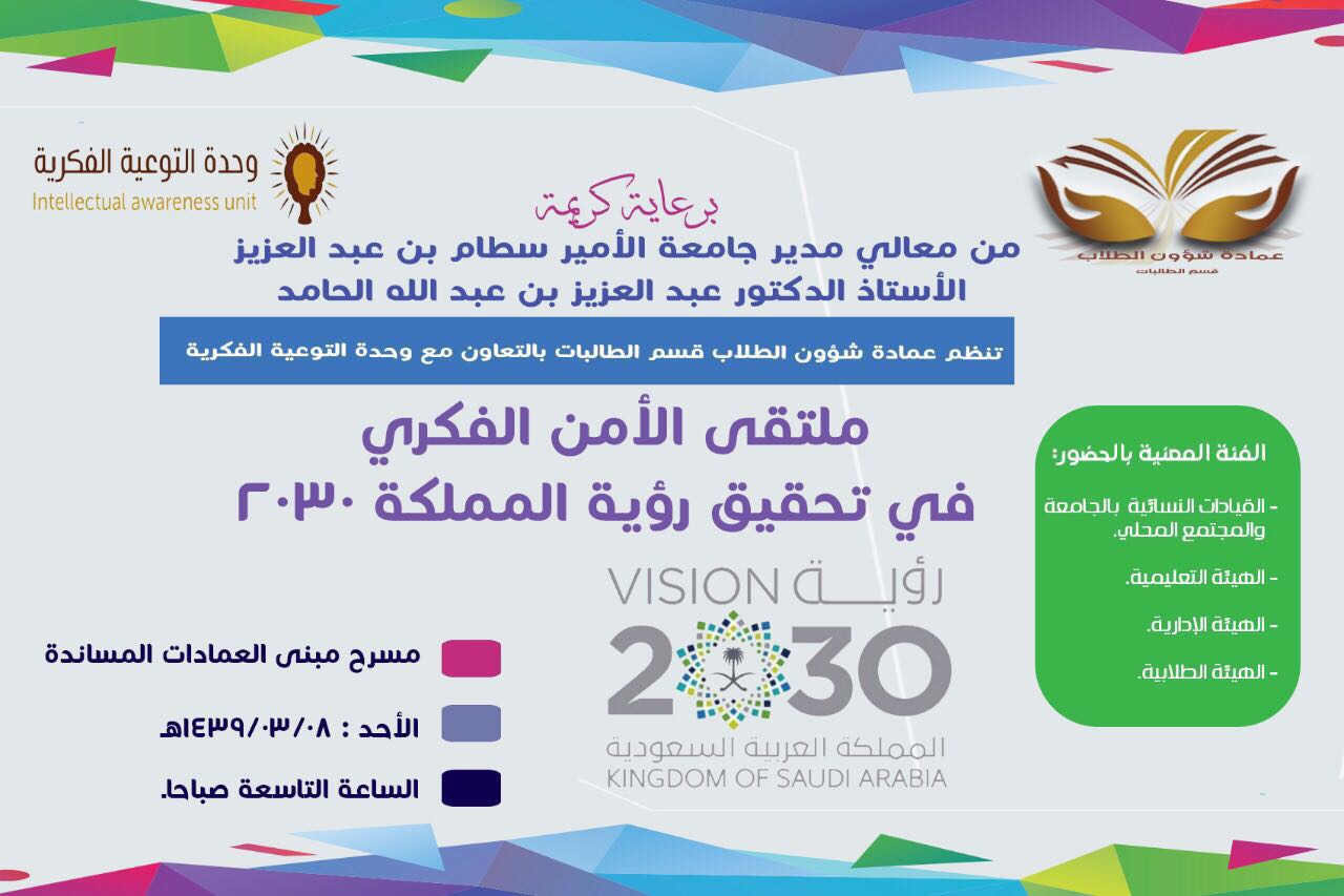 برعاية معالي مدير الجامعة الأستاذ الدكتور عبدالعزيز الحامد ينظّم قسم الطالبات بعمادة شؤون الطلاب، بالتعاون مع وحدة التوعية الفكرية، ملتقى الأمن الفكري في تحقيق رؤية المملكة ٢٠٣٠ يوم الأحد ٨/ ٣/ ١٤٣٩ على مسرح العمادات المساندة (هداية) الساعة التاسعة صباحًا.