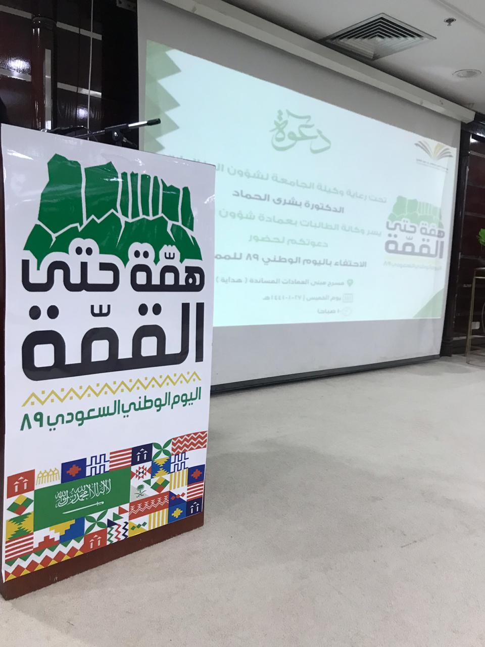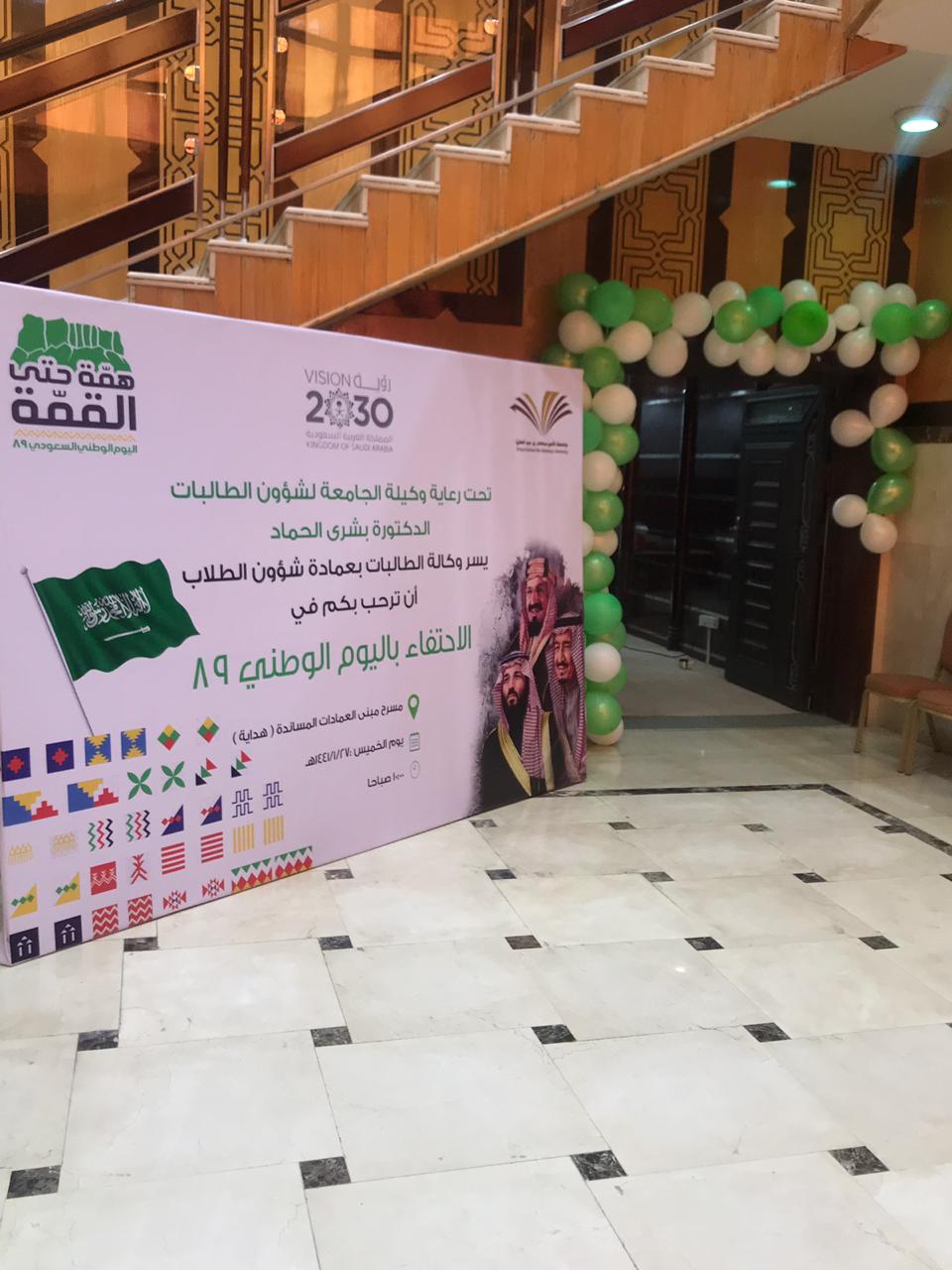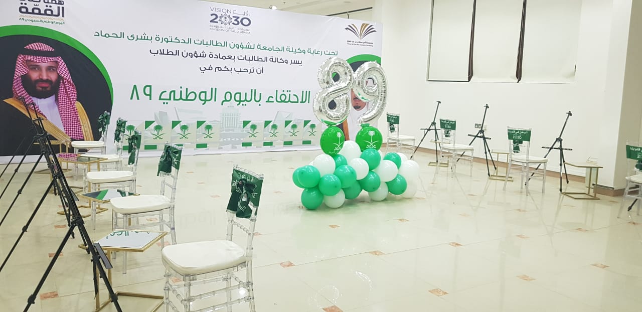 احتفاءً باليوم الوطني الـــ(89) للمملكة أقامت وكالة الطالبات حفلًا متنوّعًا يوم الخميس 27/ 1/ 1441هـ، بعمادة شؤون الطلاب، برعاية الدكتورة بشرى بنت أحمد الحماد، وكيلة الجامعة لشؤون الطالبات.