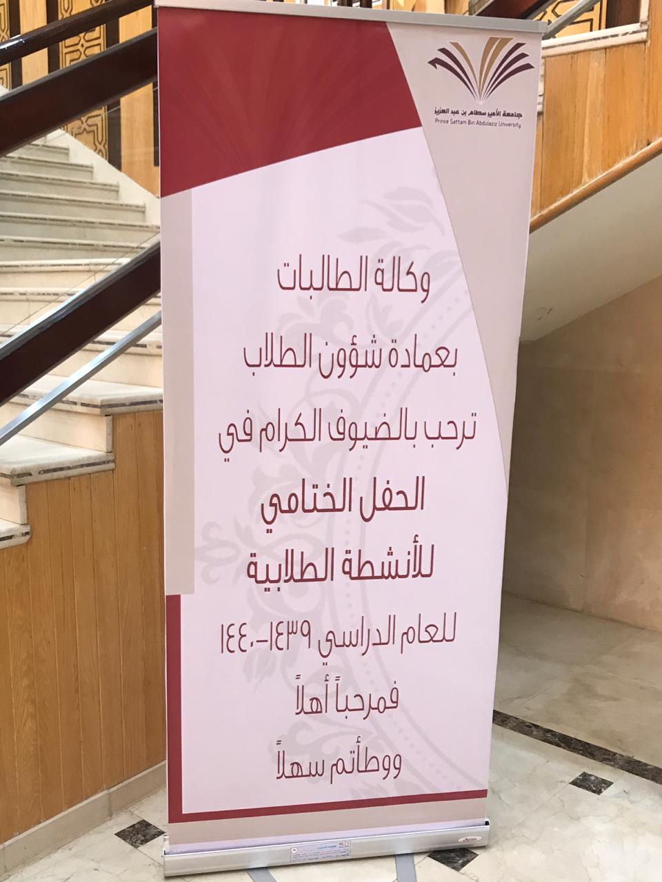 أقامت وكالة الطالبات بعمادة شؤون الطلاب حفلها الختامي للأنشطة الطلابية لهذا العام الدراسي ١٤٣٩/ ١٤٤٠، وقد شرّفت الحفل سعادة وكيلة الجامعة للشؤو الطالبات ، الدكتورة بشرى بنت أحمد الحماد. كما حضره أيضًا وكيلات الكليات وأعضاء هيئة التدريس والطالبات.
