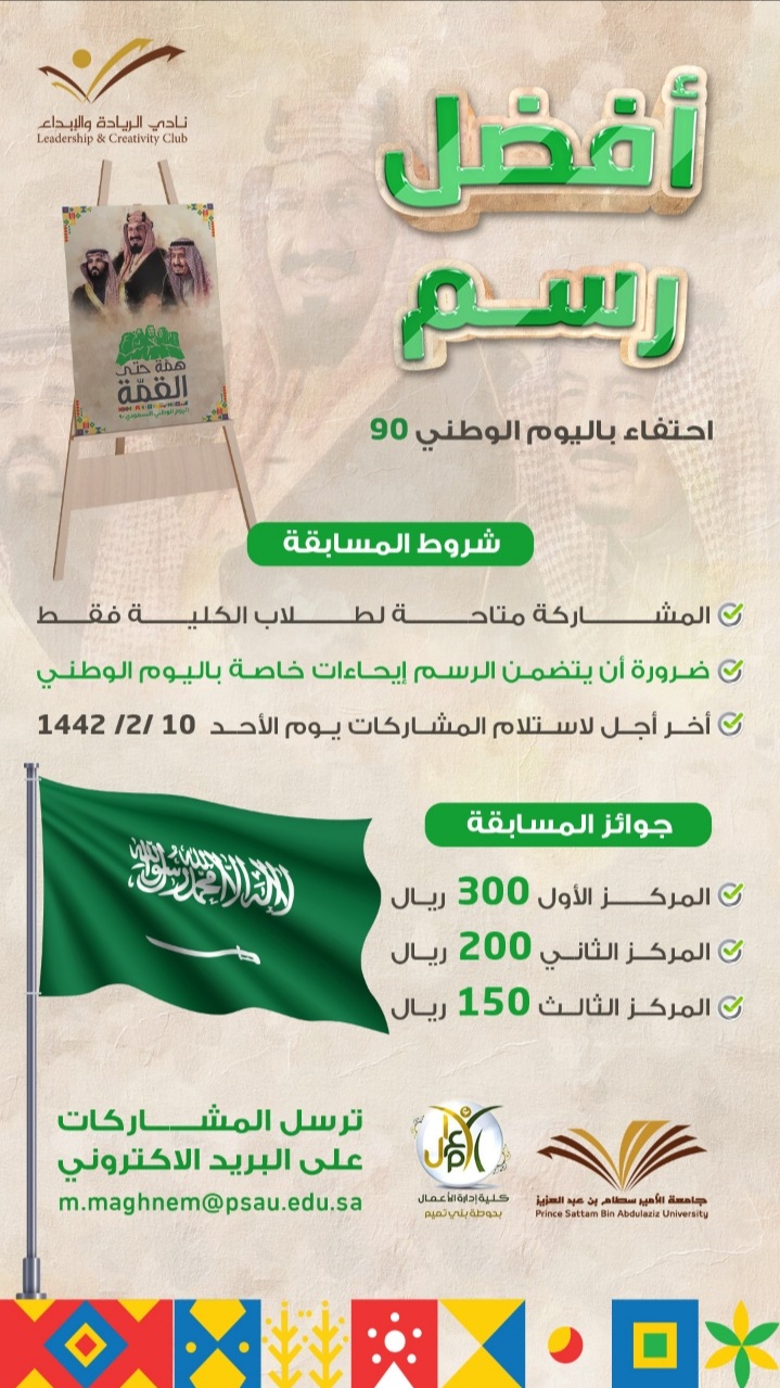 وفي ختام البرنامج الافتراضي أُعلنت أسماء الفائزين في مسابقة أفضل تغريدة، التي نظمتها الكلية قبل أيام؛ والتي تهدف إلى إشراك طلاب الكلية وسكان حوطة بني تميم في المشاركة بالتعبير عن مشاعرهم تجاه هذه المناسبة الوطنية.