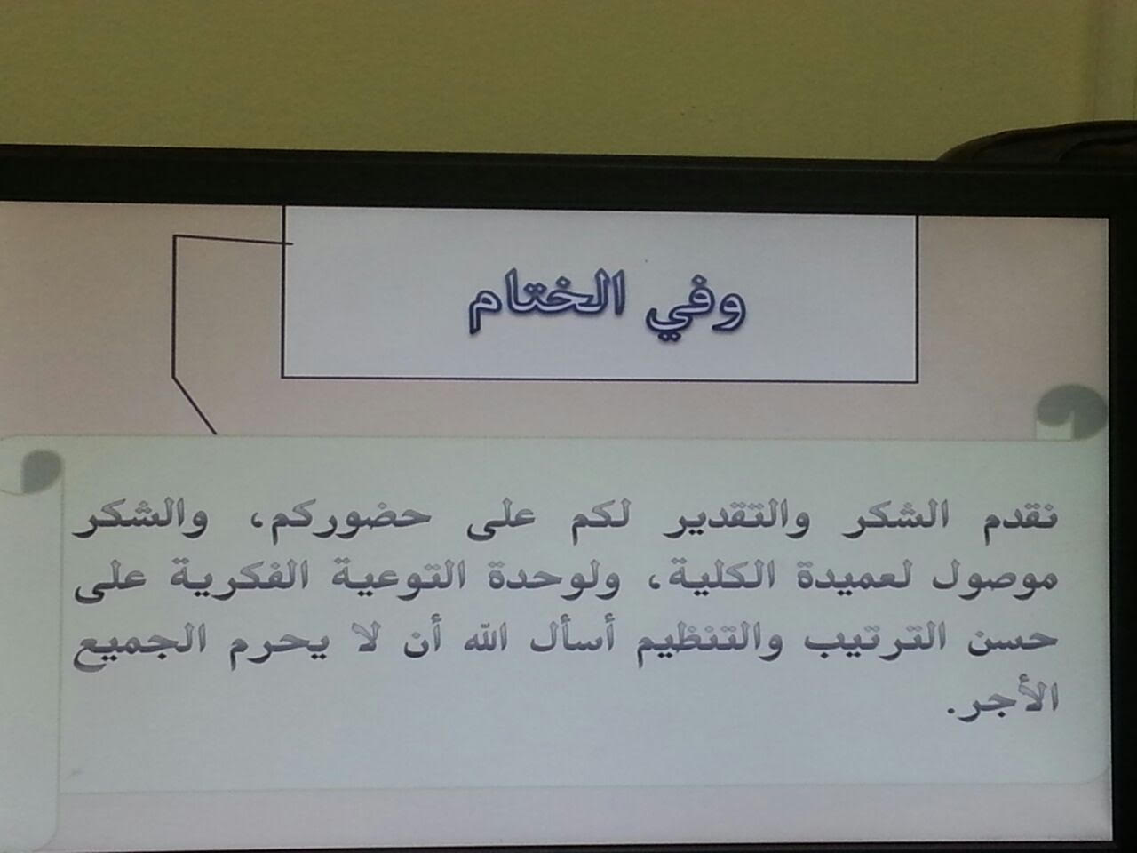 حضر البرنامج عميدة الكلية ووكيلاتها وعدد من أعضاء هيئة التدريس والإداريات والطالبات. يُذكر أن البرنامج قد تم إعداده تحت رعاية ركن المذاق للحلويات الذي قام بتقديم قسائم شرائية كجوائز لمسابقة تم طرحها من قبل الدكتور أحمد الشثري عما تم تناوله خلال البرنامج.