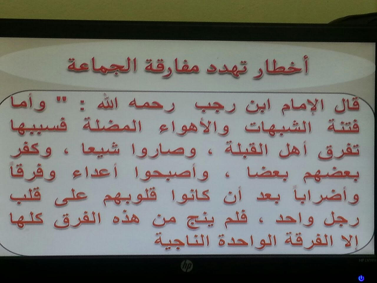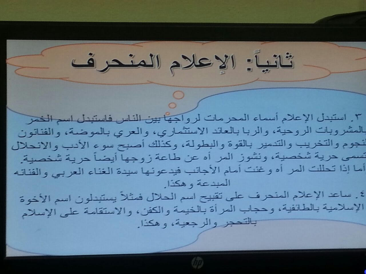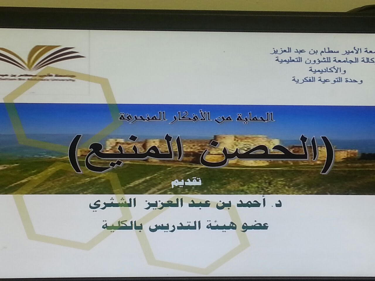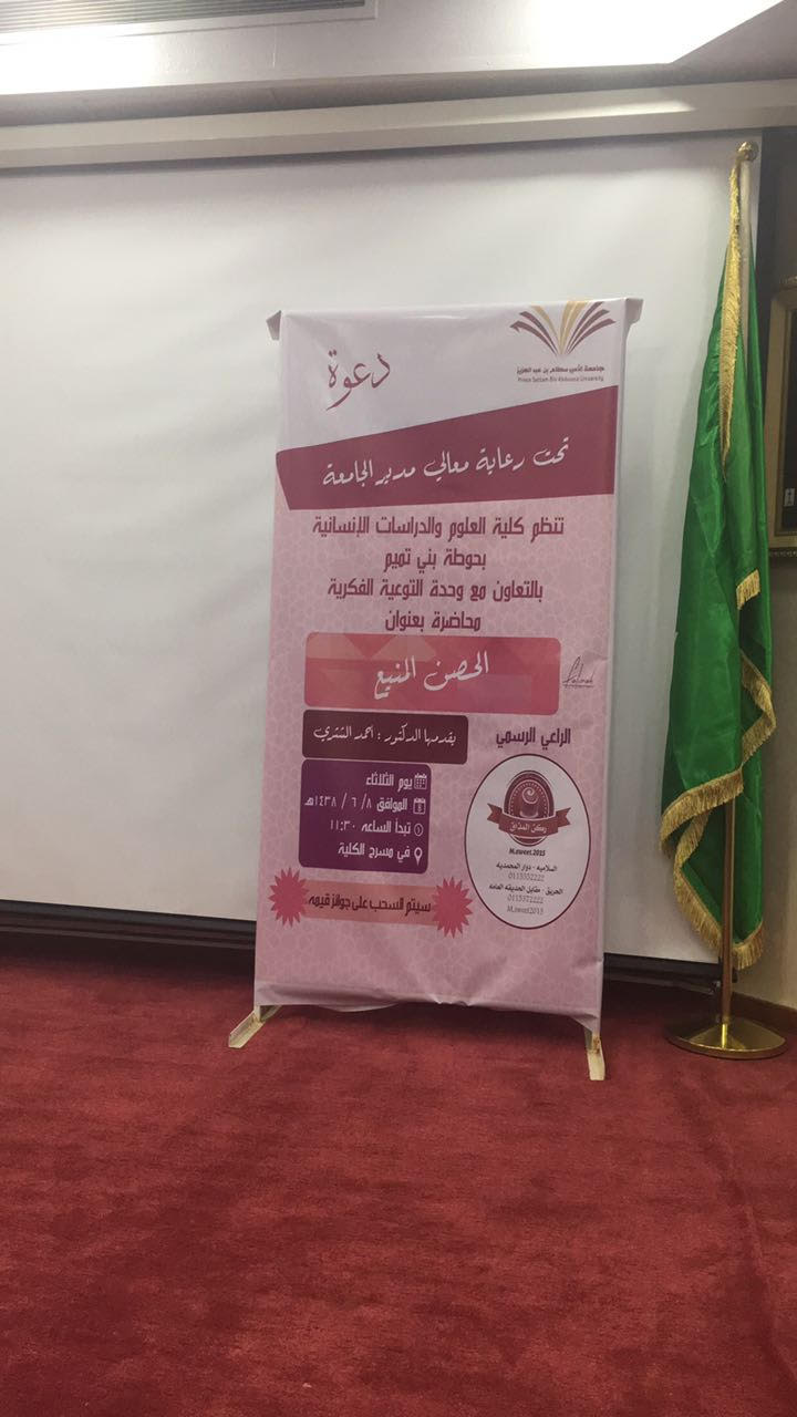 نظمت وحدة التوعية الفكرية التابعة لوكالة الجامعة للشؤون التعليمية والأكاديمية بكلية العلوم والدراسات الإنسانية بحوطة بني تميم برنامجًا بعنوان (الحصن المنيع) من إعداد وتقديم الدكتور أحمد بن عبدالعزيز الشثري الأستاذ المساعد في قسم الدراسات الإسلامية وذلك يوم الثلاثاء الموافق 8/ 6/ 1438هـ بمسرح الكلية في تمام الساعة الحادية عشر والنصف صباحًا. يهدف البرنامج إلى الحماية من الأفكار المنحرفة وتحصين العقول من خطر أفكار الجماعات الإرهابية والتكفيرية والتصدي لمظاهر الغلو والتطرف من خلال الدعوة إلى الوسطية والتسامح والاعتدال ومكارم الأخلاق التي يحث عليها الدين الإسلامي. تناول الدكتور أحمد في برنامجه عددا من المحاور منها أهمية لزوم جماعة المسلمين وصفات تلك الجماعة التي أمر النبي صلى الله عليه وسلم بلزومها وضرورة تلقي العلم عن العلماء الربانيين كما أشار إلى الأخطار التي تهدد مفارقة الجماعة وخطر الإعلام المنحرف في الترويج للأفكار التي يجب الحذر منها.