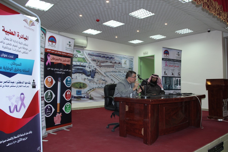 نظمت كلية إدارة الأعمال في حوطة بني تميم بالتعاون مع مستشفى حوطة بني تميم العام برنامج المبادرة الطبية، تحت عنوان: (السرطان .. أسبابه وطرق الوقاية منه)، الذي قدّمه د. عبدالناصر سخيطة الاستشاري ورئيس قسم الأطفال في مستشفى حوطة بني تميم العام، وذلك في يوم الاثنين ١٤٣٠/٦/٢٠هـ، بمسرح الكلية.