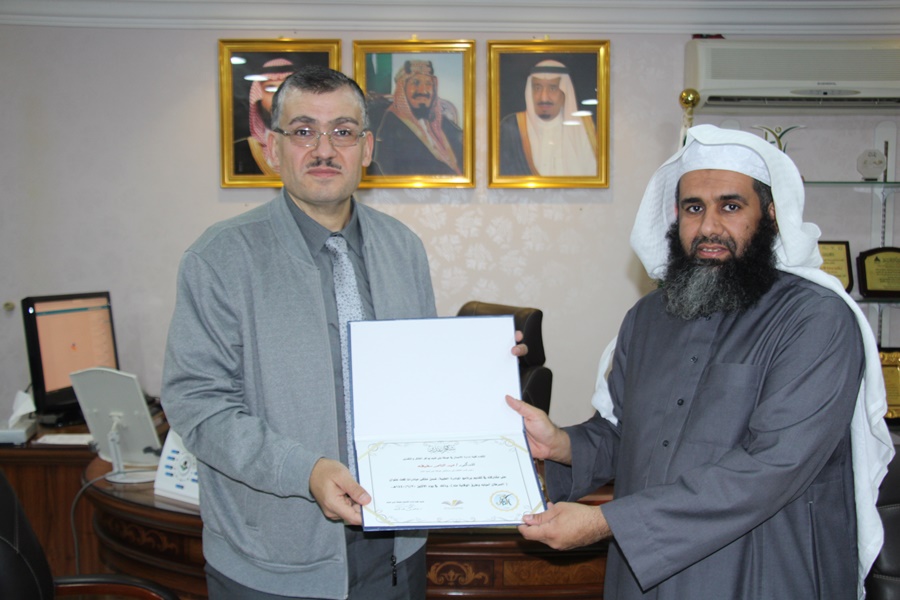 بعد ذلك قدّم عميد الكلية د. إبراهيم بن محمد الداود درعًا تقديريًّا لمستشفى حوطة بني تميم العام، كما قدّم شهادة شكر وتقدير للدكتور عبدالناصر سخيطة؛ عرفانًا بمشاركته الفاعلة في تقديم هذا البرنامج.