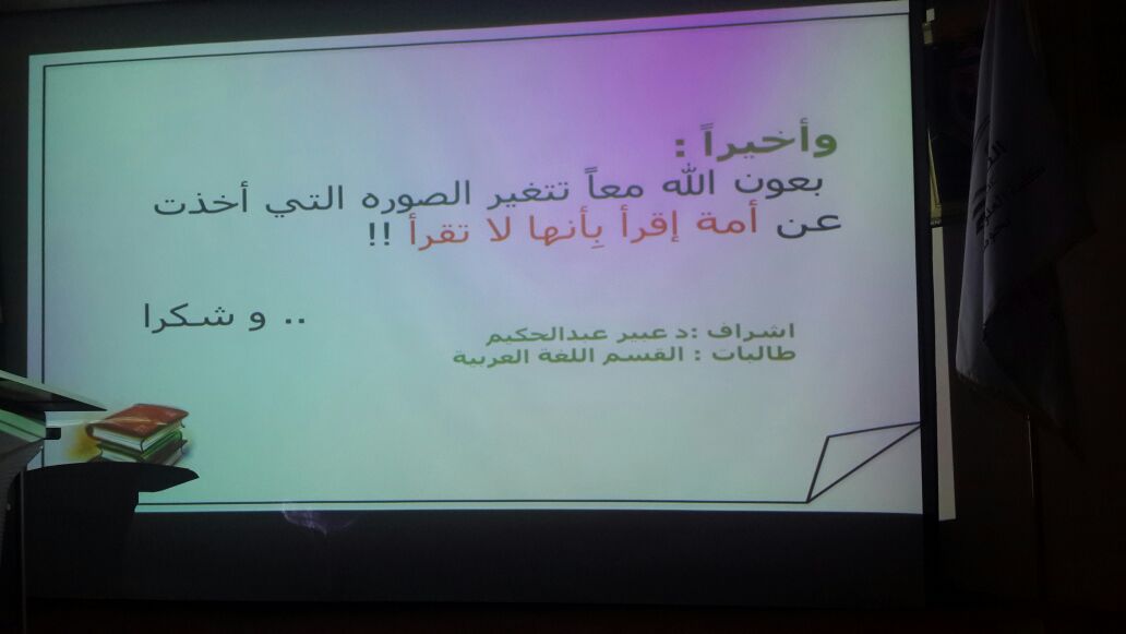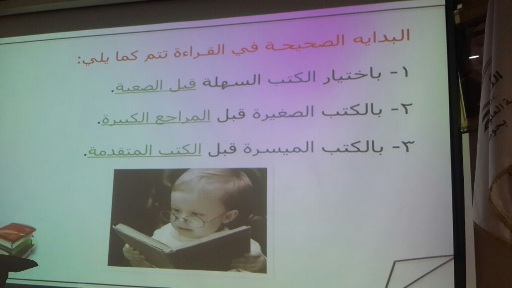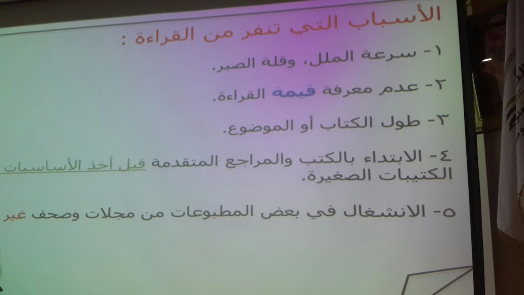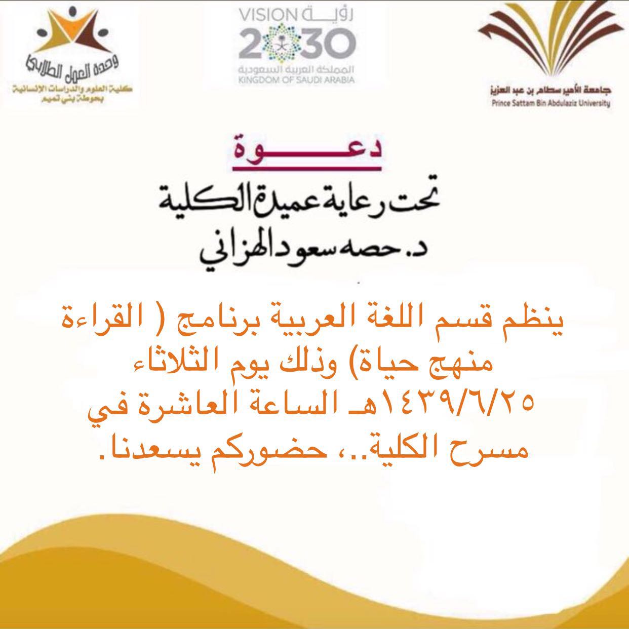 بمناسبة قرب افتتاح معرض الرياض الدولي للكتاب، وبرعاية عميدة الكلية الدكتورة حصة الهزاني، أقام قسم اللغة العربية بكلية العلوم والدراسات الإنسانية بحوطة بني تميم برنامج (القراءة منهج حياة) وذلك يوم الثلاثاء 25 / 6/ 1439 هـ في مسرح الكلية. تضمن البرنامج عدة محاور منها: لماذا نقرأ؟ والإجابة على هذا السؤال هي الطريق التي تفتح لنا باباً رحباً للقراءة لا ينتهي، ثم ذكر أهم الأسباب التي تنفر من القراءة، وكذلك التنويه على بعض المحفزات التي تحبب في القراءة وتبعد الملل، وبعض العوامل المساعدة للمداومة على القراءة، وإرشاد القراء إلى كيفية الحصول على كتاب جيد. وقد صاحب البرنامج ركن عُرض فيه بعض الكتب، وعبارات تحفز وتشجع على القراءة.