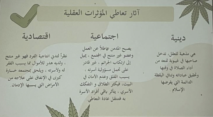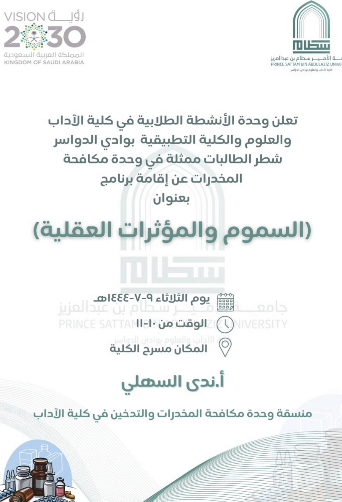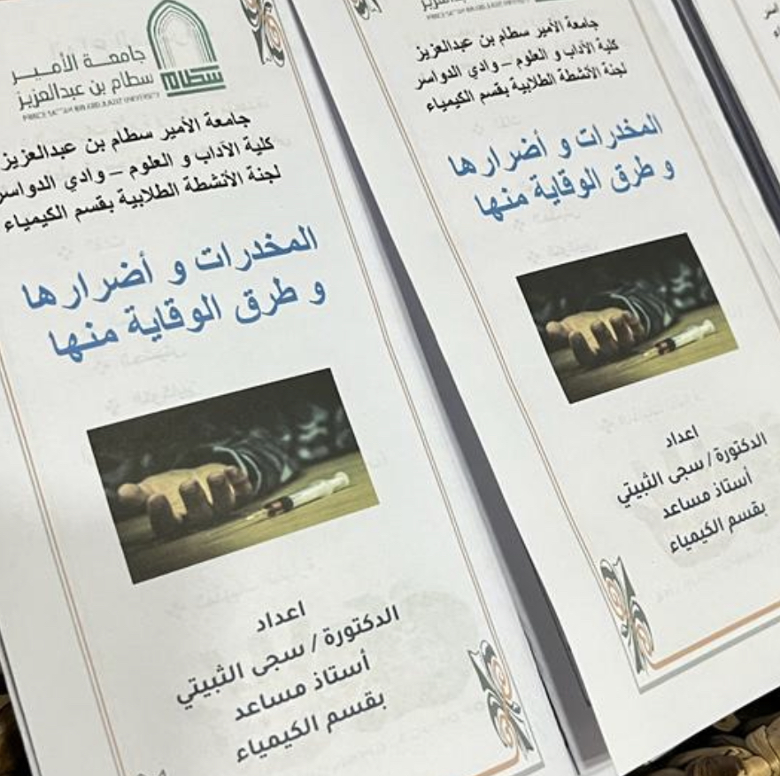 ولأهمية التوعية بشأنها ، وتحت رعاية عميدة كلية الآداب والعلوم بوادي الدواسر د. فارعة الخزاعي قدّمت وحدة مكافحة المخدرات و التدخين التابعة لوحدة الأنشطة الطلابية برنامج تثقيفي بعنوان: السموم والمؤثرات العقلية تحت إشراف أ. ندى السهلي وذلك يوم الثلاثاء الموافق ١٤٤٤/٧/٩هـ من الساعة ١٠ ص إلى الساعة ١١ ص بمسرح الكلية، ويهدف هذا البرنامج إلى توعية أفراد المجتمع من طالبات ومنسوبات الجامعة بمعرفة المؤثرات العقلية وماهي أضرارها وخطورتها وحكمها الشرعي وسبل الوقاية منها ووسائل علاج المدمن .