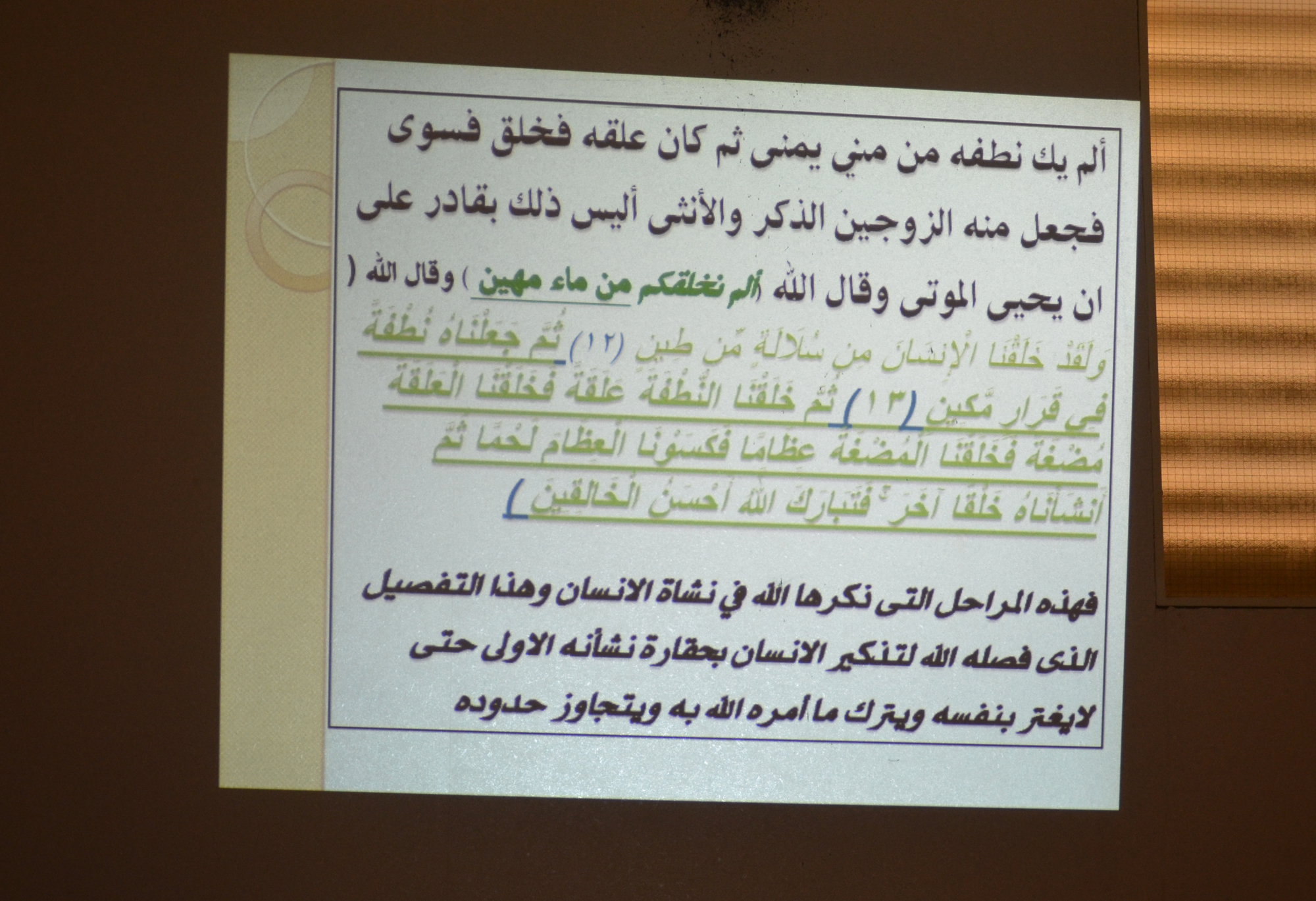 نظمت وحدة العمل الطلابي متمثلة في نادي التوعية الإسلامية بكلية العلوم والدراسات الإنسانية بالأفلاج ( شطر الطالبات ) يوم الأربعاء 1440/6/1 هـ بالتعاون مع طالبات الدراسات الإسلامية برنامج ( التفكر في مخلوقات الله ) , إذ يهدف الى التأمل والتدبر في مخلوقات الله فالتأمل عبادة يؤجر المرء عليها وخص بالذكر خلق الإنسان , حيث تناوله منذ بدايته حتى تكونه و كيف هي عظمت خلق الله له , مع ذكر الأمثلة على إسلام بعض علماء الغرب بعد وقوفهم على الإعجاز العلمي في خلق الإنسان المذكور في القرآن الكريم .