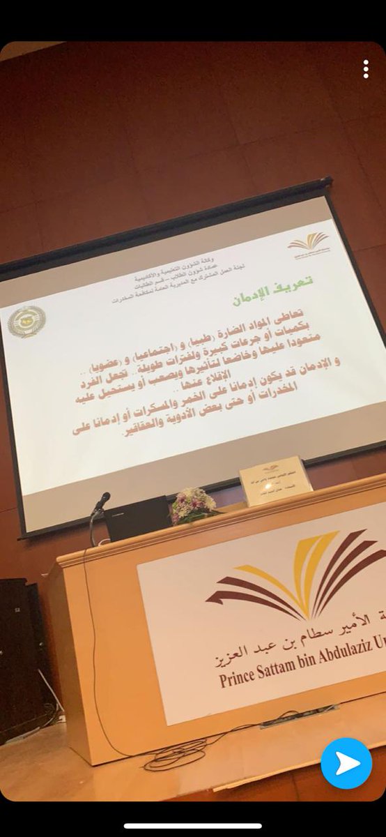 ضمن البرامج التدريبية والتوعوية برنامجاً توعوياً بعنوان ( التفكير الإيجابي لمجتمع واعٍ من آفة المخدرات) يوم الثلاثاء 23/5/1440هـ في مسرح الكلية من إعداد وتقديم االإستاذة: حنان آل عبدالقادر وبإشراف منسقة البرامج التوعوية الإستاذة أسماء الزهراني، وبالتعاون وحدة العمل الطلابي بالكلية