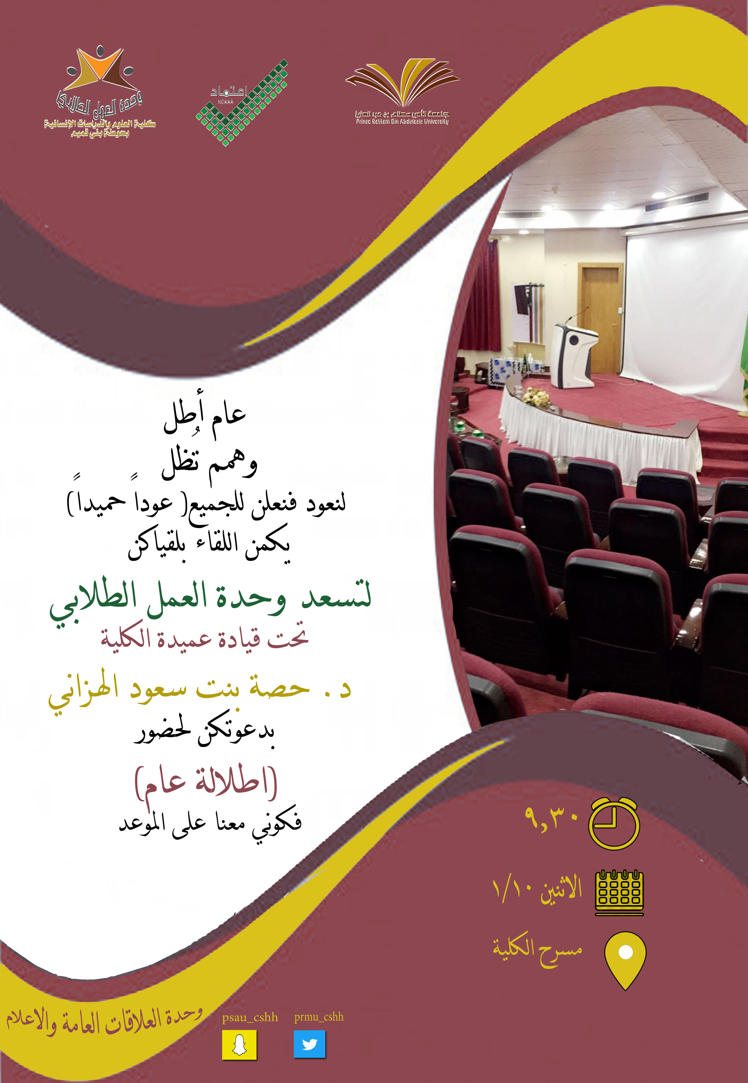 unicode-bidi:embed">في مستهل عامٍ جديدٍ ومع بداية الحلُم المرجو تحقيقه، في ظل قائدتنا عميدة الكلية د. حصة بنت سعود الهزاني أقامت وحدة العمل الطلابي يوم الأثنين الموافق 10\1\1441هـ . في تمام الساعة التاسعة والنصف صباحًا في مسرح الكلية برنامج ( إطلالة عام ) للطالبات، وهدف البرنامج إلى تعزيز المفاهيم لدى الطالبة ،للدراسة الأكاديمية، وتوضيح المفاهيم والتعليمات التي يجب على الطالبة اتباعها في المرحلة الجامعية ،لتصدي العثرات التي قد تحصل لها خلال الدراسة الجامعية. و قدم البرنامج تعريفًا بوحدة العمل الطلابي وأقسامه ، إذ ابتدأ بمقدمة ترحيبية بالحضور ثم تُليت آيات من الذكر الحكيم ، عقبتها كلمة العميدة مرحبة بالطالبات والطالبة المستجدة بوجه الخصوص ، ومُبينة أهمية الانضباط في الدراسة ، وتحدثت بعد ذلك عن كيفية تتبع الطالبة خطتها الدراسية للعام الجامعي الحالي، والتواصل مع وحدة القبول والتسجيل وشؤون الطالبات عند أي تعثر أو عقبة، وكما أكدت على الطالبات المشاركة في الأنشطة الطلابية وبينت أهدافها في تطوير مهاراتهن وإبداعاتهن في ظل النهضة التي تحظى بها جامعة سطام بن عبدالعزيز للرقي بها فخرًا بالوطن .وبعد ذلك ألقت مشرفة وحدة العمل الطلابي أ/ إسلام العمري كلمتها وشجعت الطالبات للانضمام إلى الأنشطة اللاصفية ، وبينت أهمية الوحدة الطلابية في صقل مواهب الطالبات ،ووضحت أقسام الوحدة من الأنشطة الثقافية والاجتماعية والأندية الطلابية والمجالس الطلابية الاستشارية وتوضيح دور الملتقى العلمي وأهمية المشاركة بمحاور الملتقى .خُتم الحفل بشكرالحضور من الأعضاء والإداريات وخُصت الطالبات المستجدات بجزيل الشكر متمنين لهن التوفيق والنجاح.