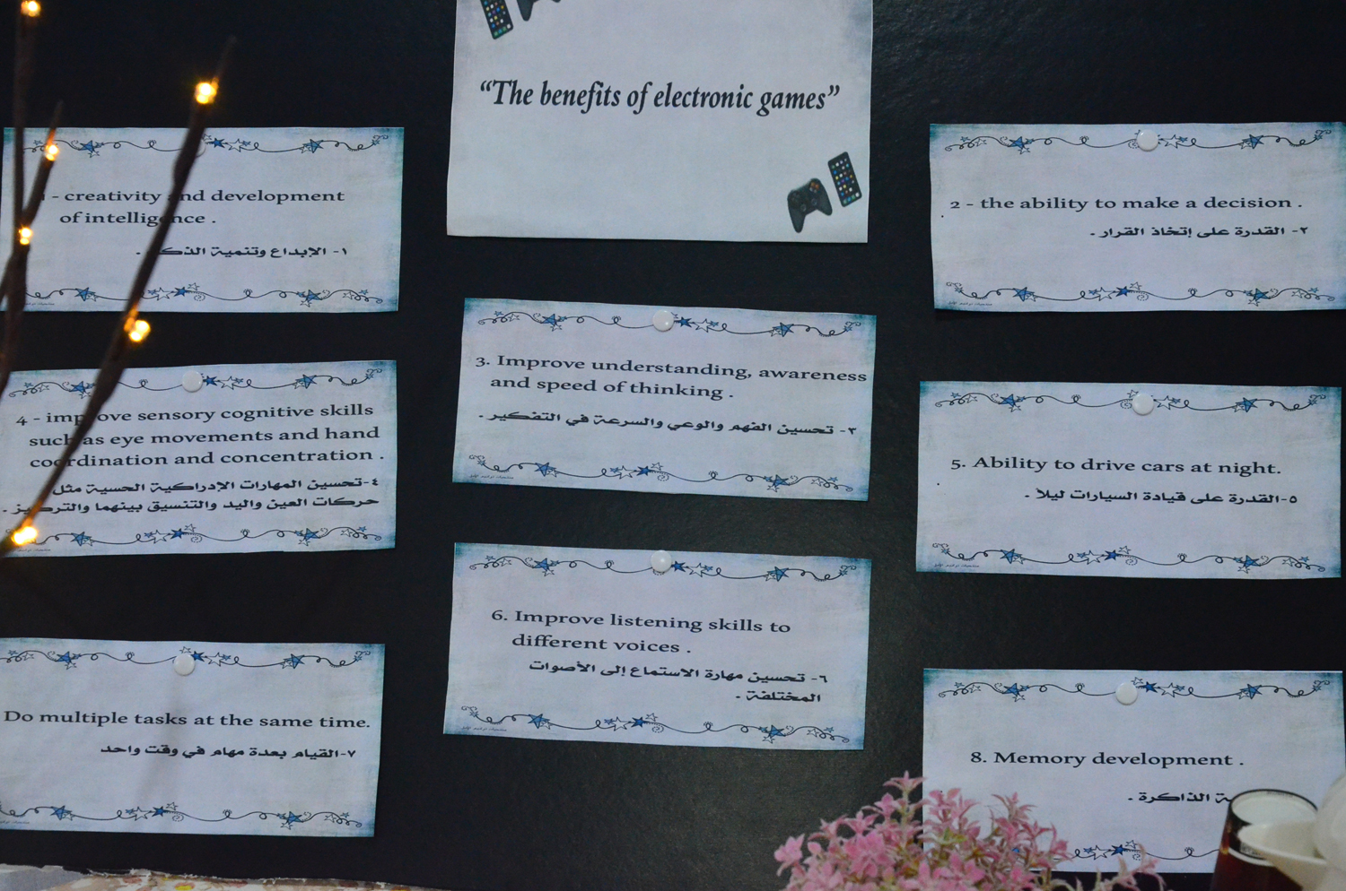 نظمت وحدة العمل الطلابي متمثلة في نادي اللغة الإنجليزية بكلية العلوم والدراسات الإنسانية بالأفلاج ( شطر الطالبات ) يوم الأحد 1440/7/17 هـ الساعة التاسعة والنصف صباحاً في قاعة الأنشطة برنامج ( إيجابيات و سلبيات الألعاب الإلكترونية ) , تمحور البرنامج حول الألعاب الإلكترونية وأثارها السلبية و الإيجابية على الأطفال و المراهقين والشباب , كما ذُكِر الأكثر شيوعاً وانتشاراً منها وأيضاً تأثيرها السلبي كالتخويف و الترهيب و إيذاء النفس والضغط النفسي و الإدمان وكذلك تعليم العنف و جعل القتل أمراً مستهجناً , وكما ذكرت الجوانب السلبية لم تهمل الجوانب الإيجابية التي تعود بالنفع على مستخدميها كتنمية المهارات اللغوية و الذكاء وتحسين الفهم والوعي وكذلك تنظيم الوقت , يهدف البرنامج إلى رفع الوعي الثقافي بهذه البرامج وأضرارها .