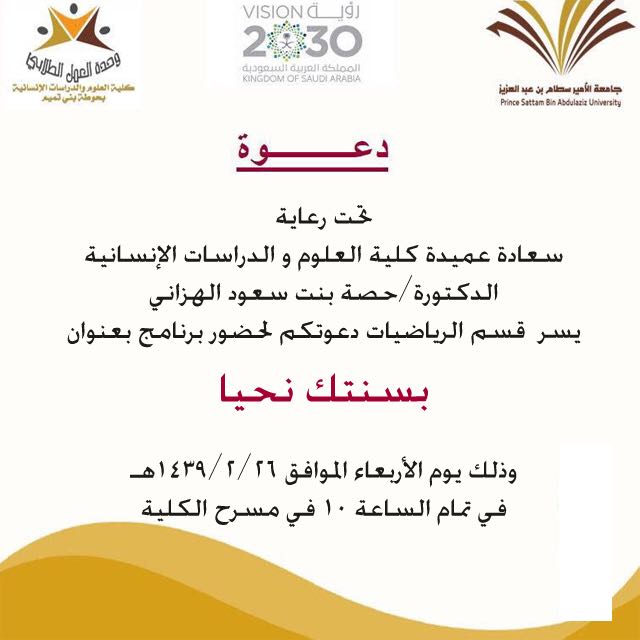 تحت رعاية عميدة كلية العلوم والدراسات الإنسانية بحوطة بني تميم الدكتورة حصة بنت سعود الهزاني، وبالتعاون مع وحدة العمل الطلابي نظم قسم الرياضيات برنامج بعنوان (بسنتك نحيا) يوم الأربعاء الموافق٢٦ /٢/ ١٤٣٩ هـ في مسرح الكلية. حث البرنامج على إحياء سنة النبي محمد صلى الله عليه وسلم وإتباعها وعرض بعض من السنن المنسية والتذكير بها. وشهد البرنامج حضورا من قبل الأعضاء والطالبات.