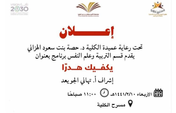 تماشيًا مع تطور الحياة وارتباطها بالتقنية، قدم قسم التربية وعلم النفس برنامجًا بعنوان " يكفيك هدرًا " في ظل قيادة عميدة كلية العلوم والدراسات الإنسانية بحوطة بني تميم د. حصة بنت سعود الهزاني وكان ذلك يوم الأربعاء الموافق: ١٤٤١/٢/١٠ هـ في تمام الساعة ١١:٠٠ صباحًا في مسرح الكلية. دارت محاور البرنامج حول (السوشل ميديا) وجنون الشهرة، فعُرضت مقاطع تمثيلية رائعة تجسّد الوضع الحالي الذي يقدمه مشاهير (السناب شات) للمتابعين إيجابية كانت أم سلبية، وأشارت المقاطع إلى ضياع ضمير بعض المعلنين من المشاهير وعدم مصداقية بعض المنتجات المعروضة، ثم أُجري حوار بين الطالبات عن تأثير تلك البرامج عليهن وكيف تمت الاستفادة منها. وقد هدف البرنامج إلى بيان الصورة الصحيحة التي يمارسها مشاهير تلك البرامج ، وتوجيه الحضور إلى الحرص على اختيار ومتابعة من يقدم الفائدة المرجوّة ومن يعمل بذمة وضمير من هؤلاء المشاهير. ولقي البرنامج حضوراً وتفاعلاً كبيراً.